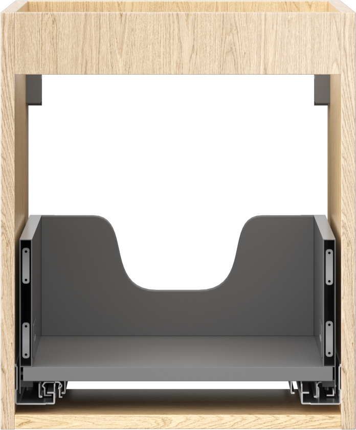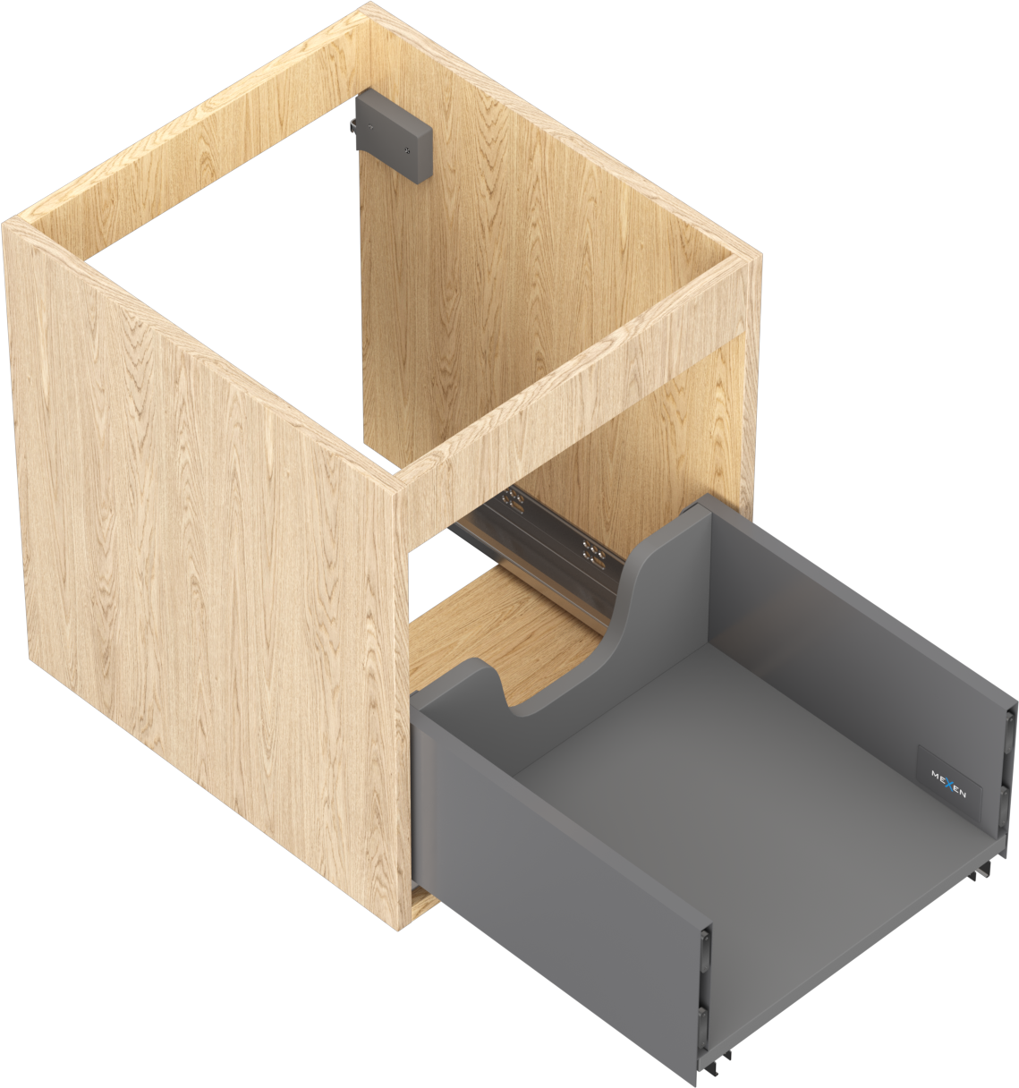 La découpe dans le tiroir est conçue de manière à accueillir le siphon, qui est nécessaire dans les installations de lavabo. Ainsi, le meuble peut être installé de manière pleinement fonctionnelle, sans devoir renoncer à l'espace du tiroir au profit de l'installation.