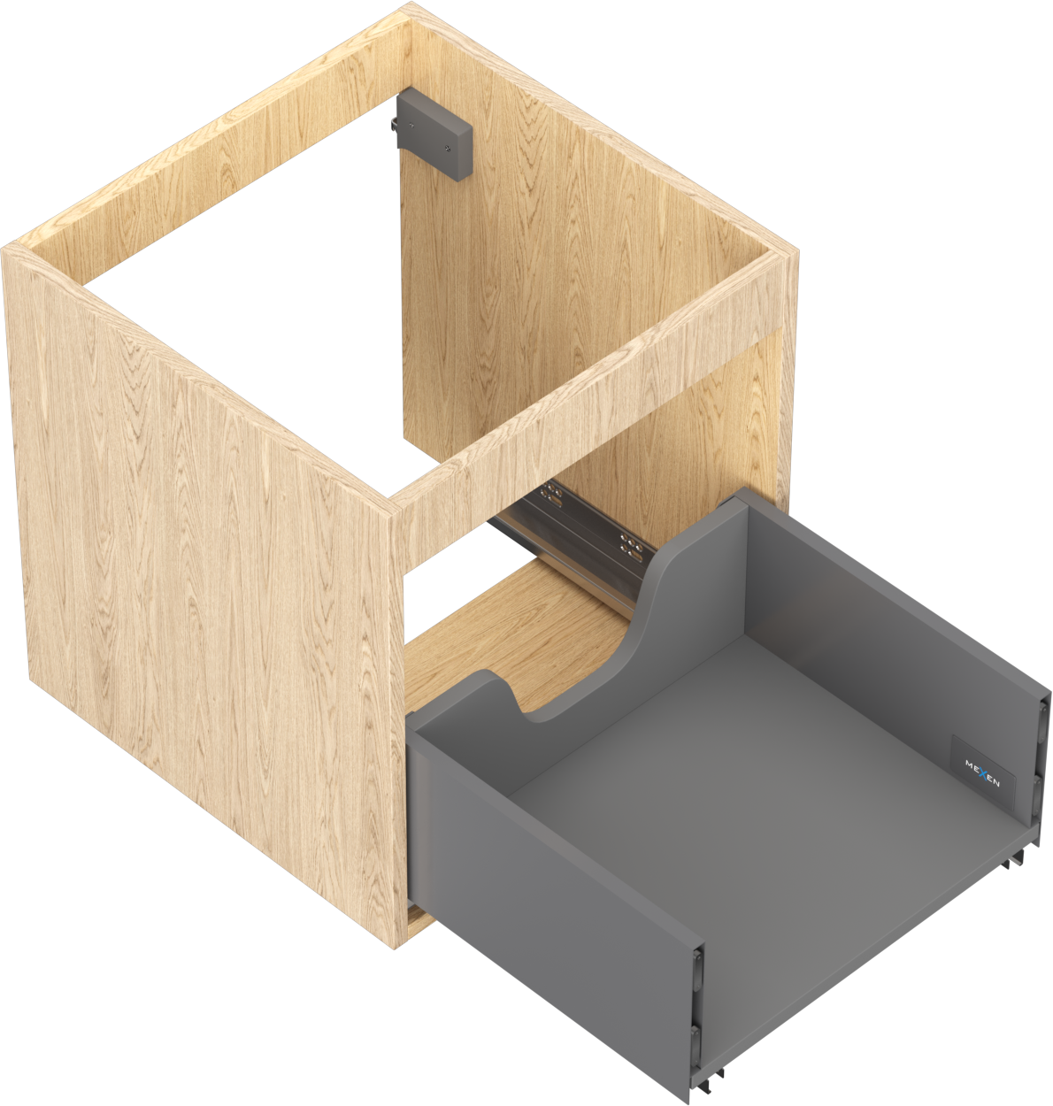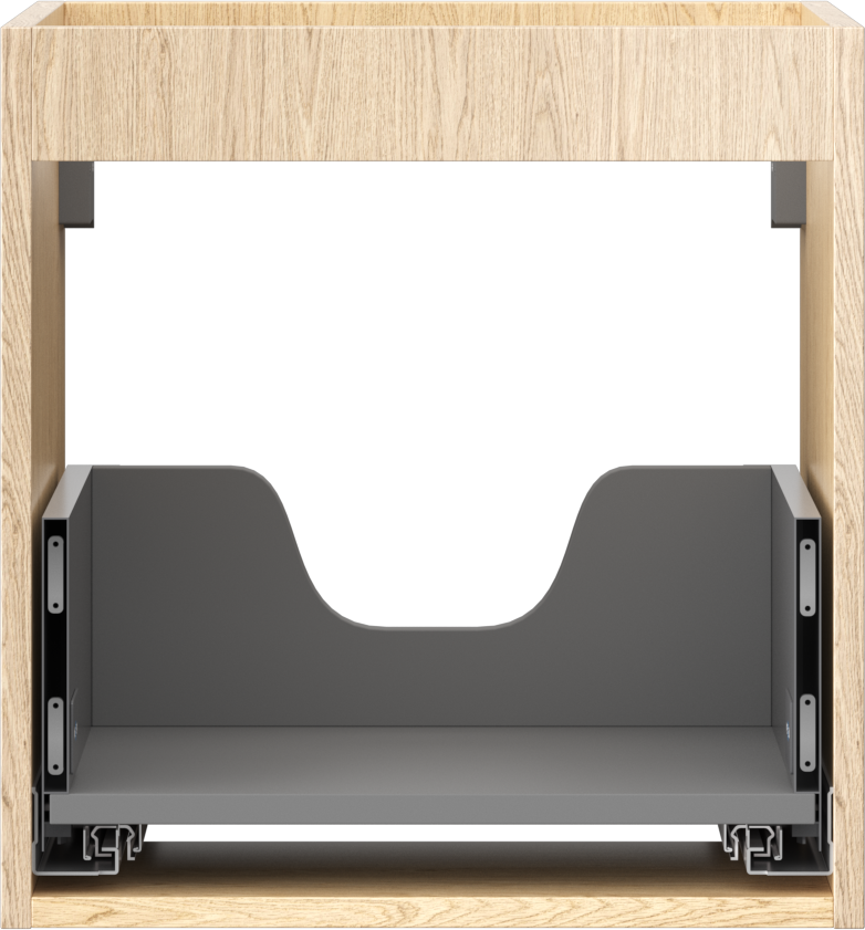 La découpe dans le tiroir est conçue de manière à accueillir le siphon, qui est nécessaire dans les installations de lavabo. Ainsi, le meuble peut être installé de manière pleinement fonctionnelle, sans devoir renoncer à l'espace du tiroir au profit de l'installation.