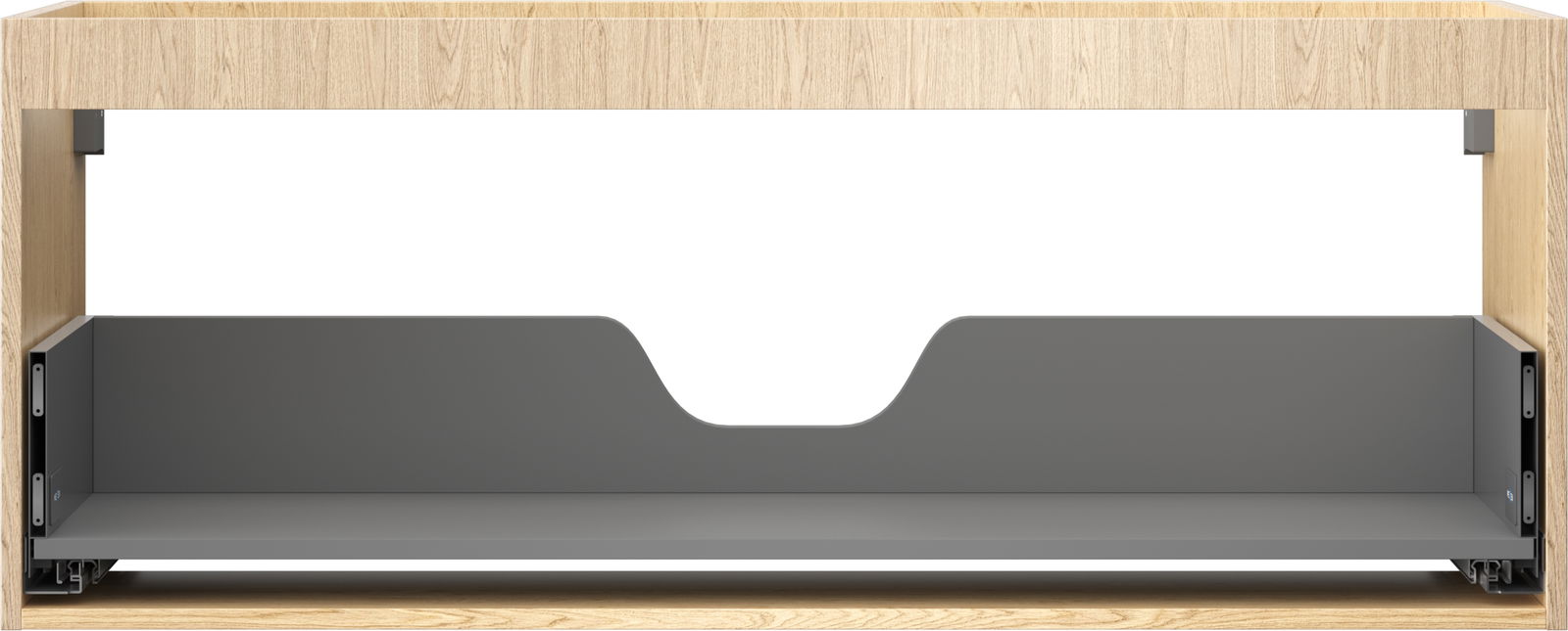 La découpe dans le tiroir est conçue de manière à accueillir le siphon, qui est nécessaire dans les installations de lavabo. Ainsi, le meuble peut être installé de manière pleinement fonctionnelle, sans devoir renoncer à l'espace du tiroir au profit de l'installation.