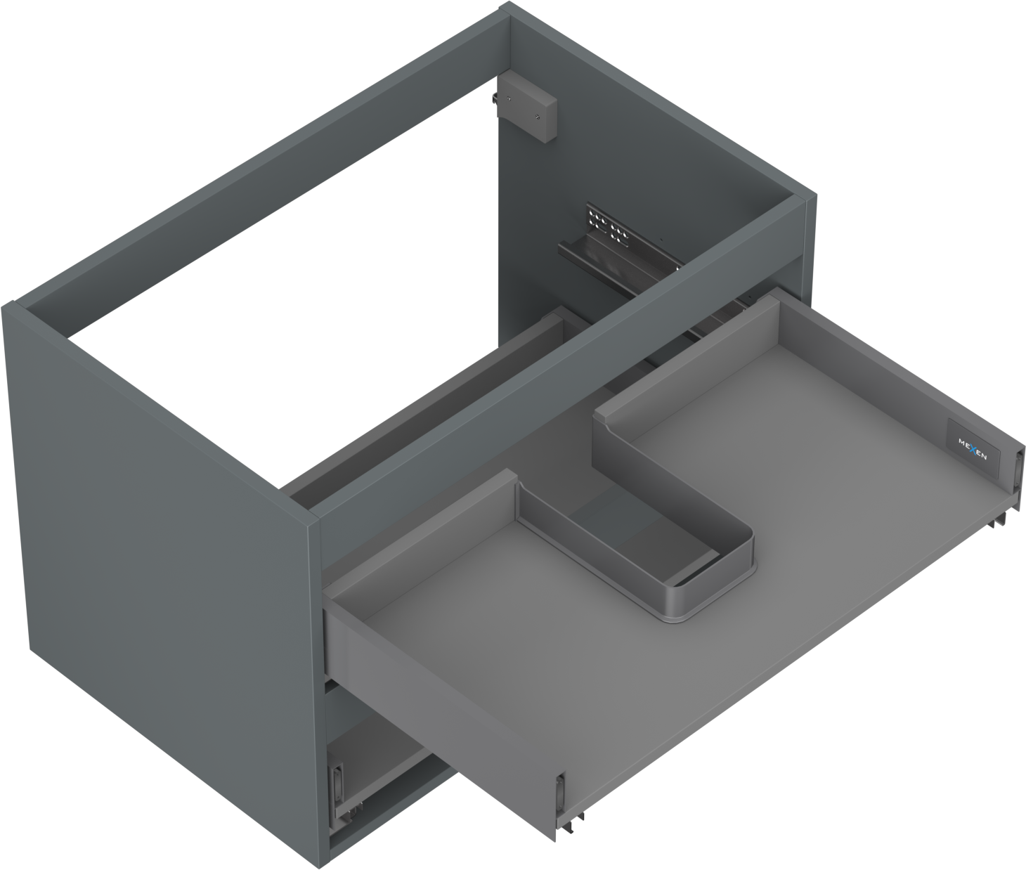 La découpe dans le tiroir est conçue de manière à accueillir le siphon, qui est nécessaire dans les installations de lavabo. Ainsi, le meuble peut être installé de manière pleinement fonctionnelle, sans devoir renoncer à l'espace du tiroir au profit de l'installation.
