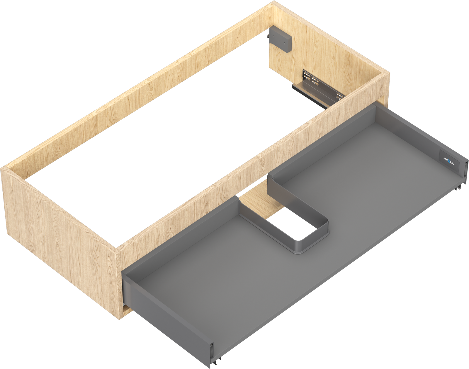 La découpe dans le tiroir est conçue de manière à accueillir le siphon, qui est nécessaire dans les installations de lavabo. Ainsi, le meuble peut être installé de manière pleinement fonctionnelle, sans devoir renoncer à l'espace du tiroir au profit de l'installation.