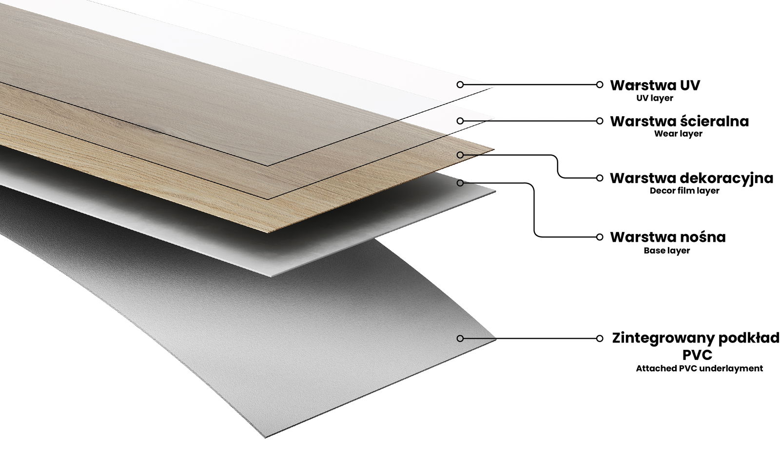 Lorsque vous posez des panneaux en vinyle, il est important de se souvenir d'utiliser un sous-plancher qui sert d'isolation thermique et acoustique, et qui assure également la stabilité du sol. Notre produit dispose d'un support intégré - grâce à cette solution, il n'est pas nécessaire de disposer des matériaux supplémentaires sur le sol, ce qui rend la pose du sol beaucoup plus pratique et rapide.