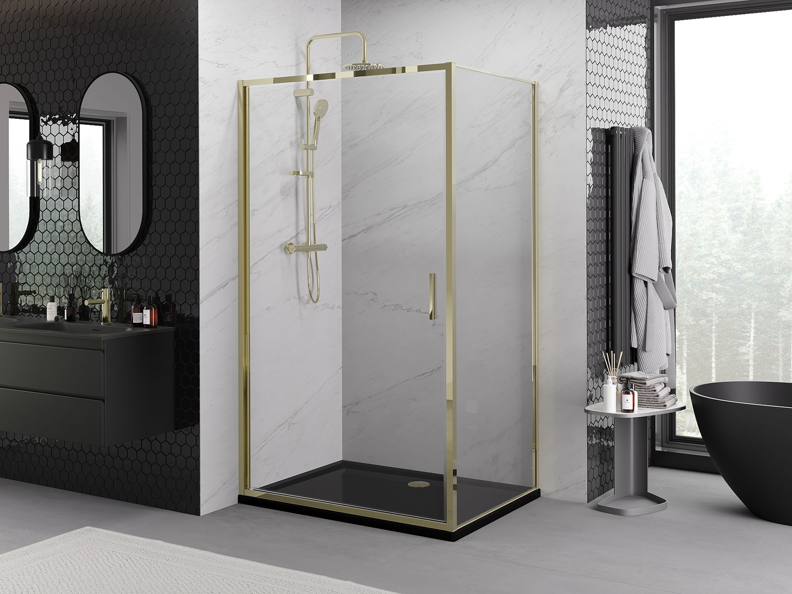 La poignée pratique et confortable est fabriquée en métal durable et résistant. Sa forme à la mode, combinée à une finition assortie à la couleur des profilés, donne à l'ensemble un aspect moderne et stylé, soulignant l'esthétique de chaque salle de bain.