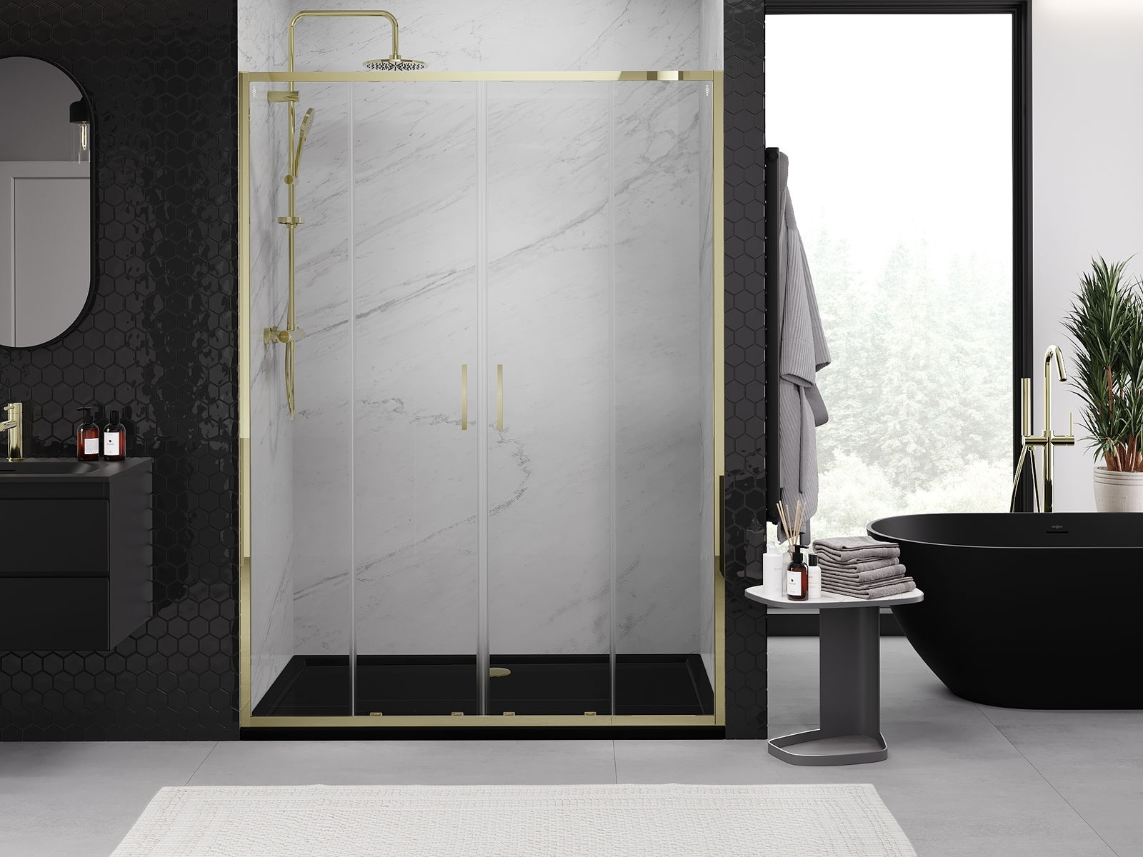 La poignée pratique et confortable est fabriquée en métal durable et résistant. Sa forme à la mode, combinée à une finition assortie à la couleur des profilés, donne à l'ensemble un aspect moderne et stylé, soulignant l'esthétique de chaque salle de bain.