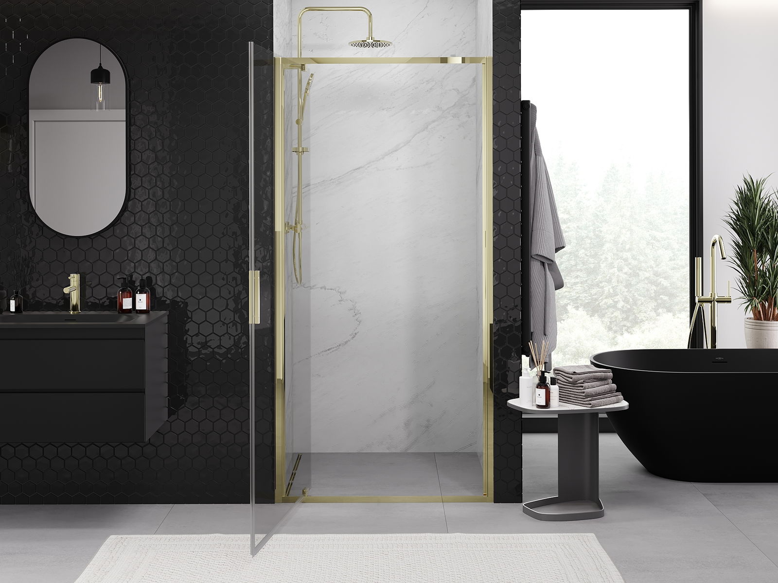 La poignée pratique et confortable est fabriquée en métal durable et résistant. Sa forme à la mode, combinée à une finition assortie à la couleur des profilés, donne à l'ensemble un aspect moderne et stylé, soulignant l'esthétique de chaque salle de bain.