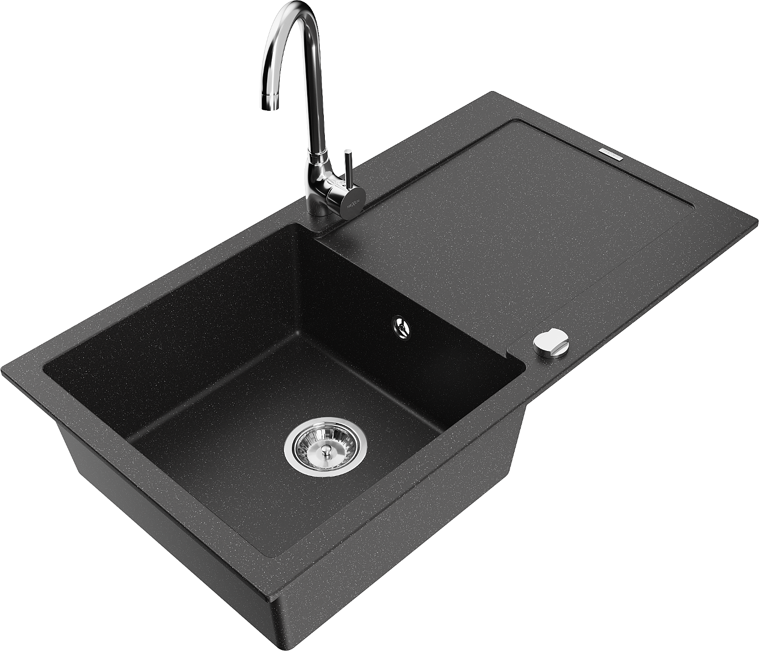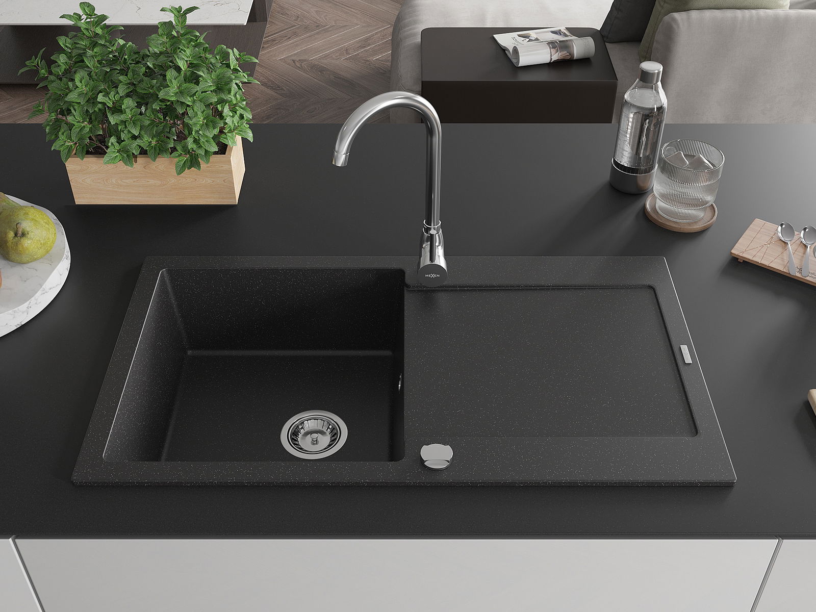 Mexen Leo évier en granit 1 bac avec égouttoir et robinet de cuisine Telma, noir/métallisé argent - 6501-73-670200-00