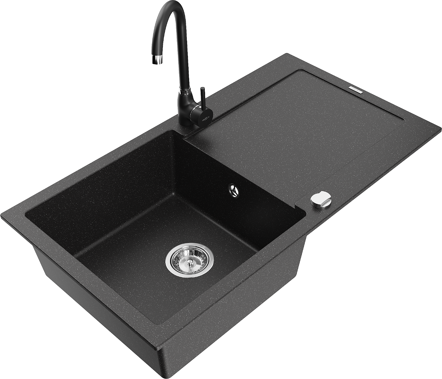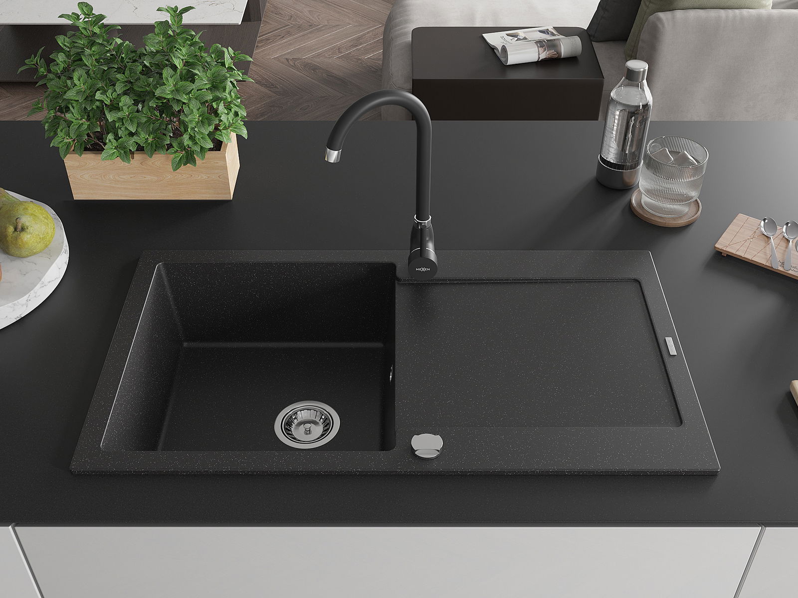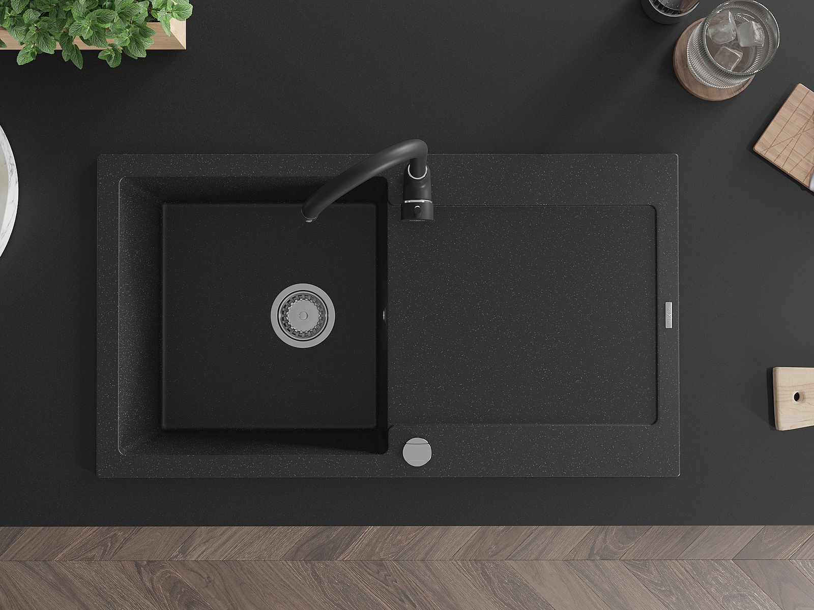 Mexen Leo évier en granit 1 bac avec égouttoir et robinet de cuisine Telma, noir/métallique argent - 6501-73-670200-70