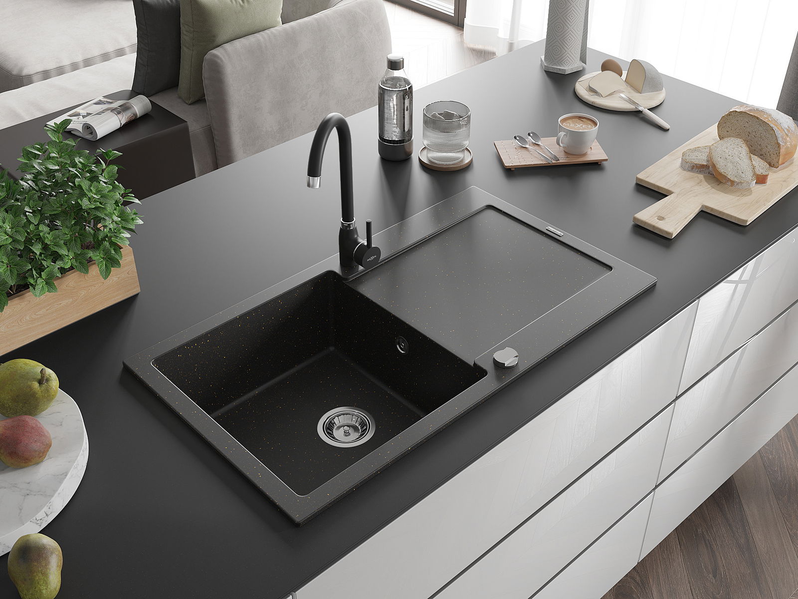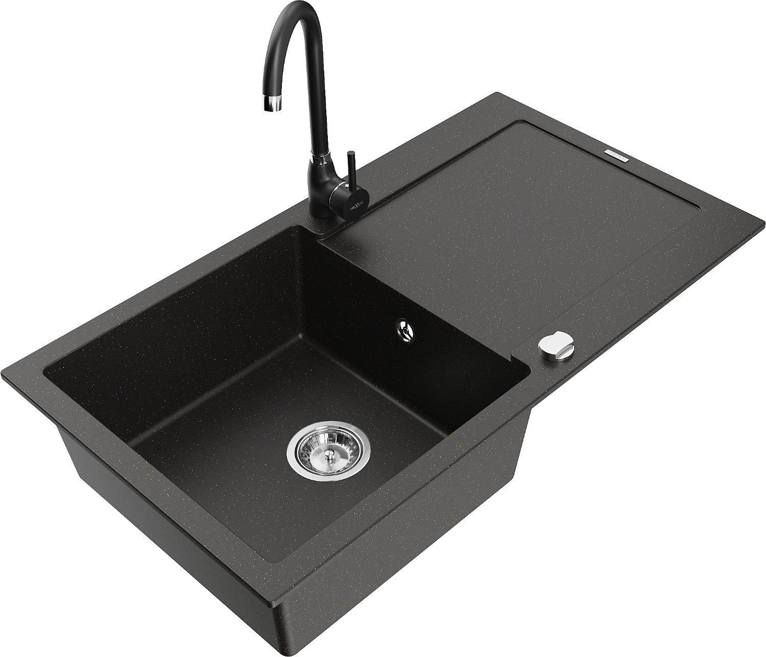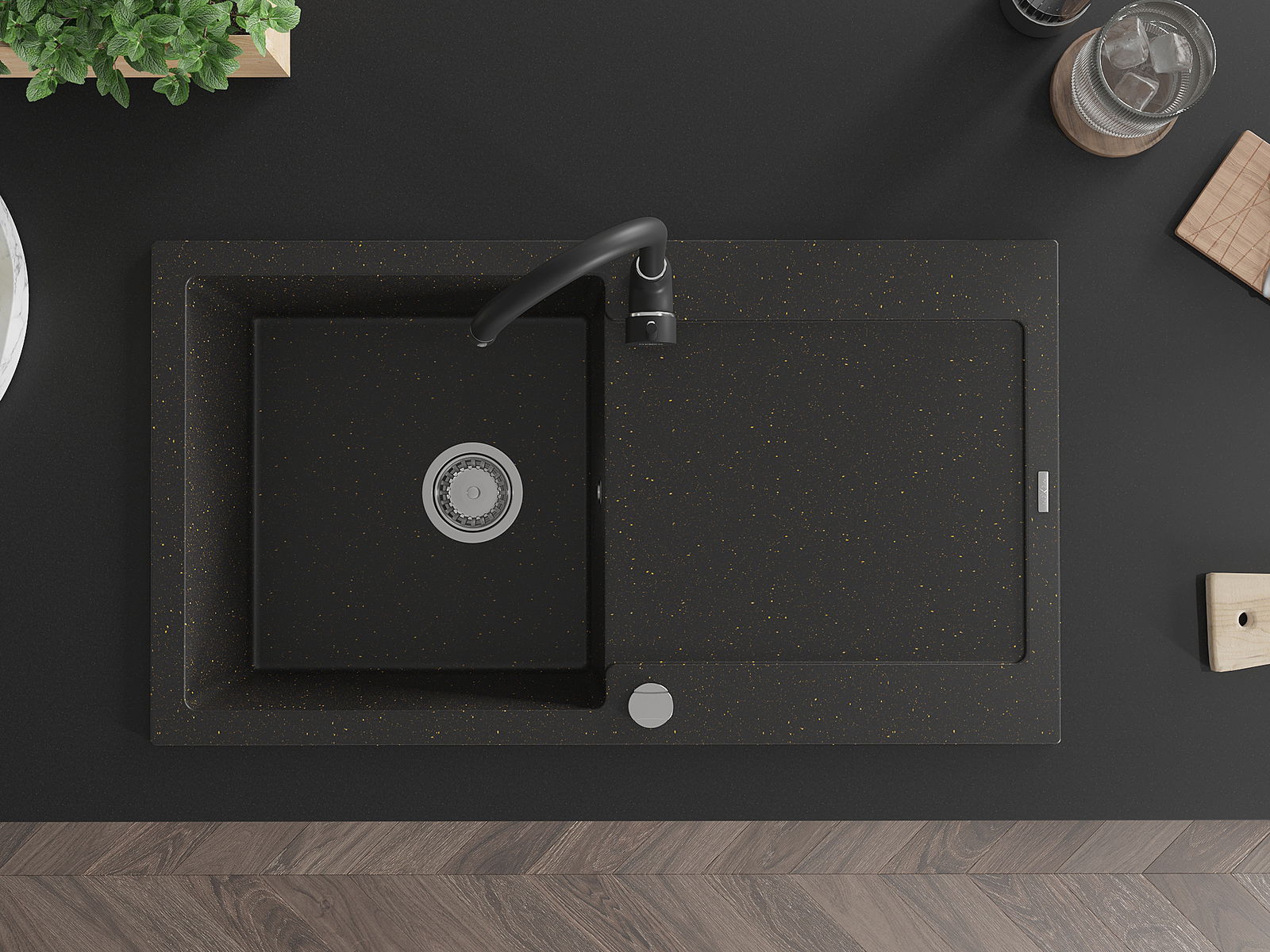 Mexen Leo évier en granit 1 bac avec égouttoir et robinet de cuisine Telma, noir/or métallique - 6501-75-670200-70