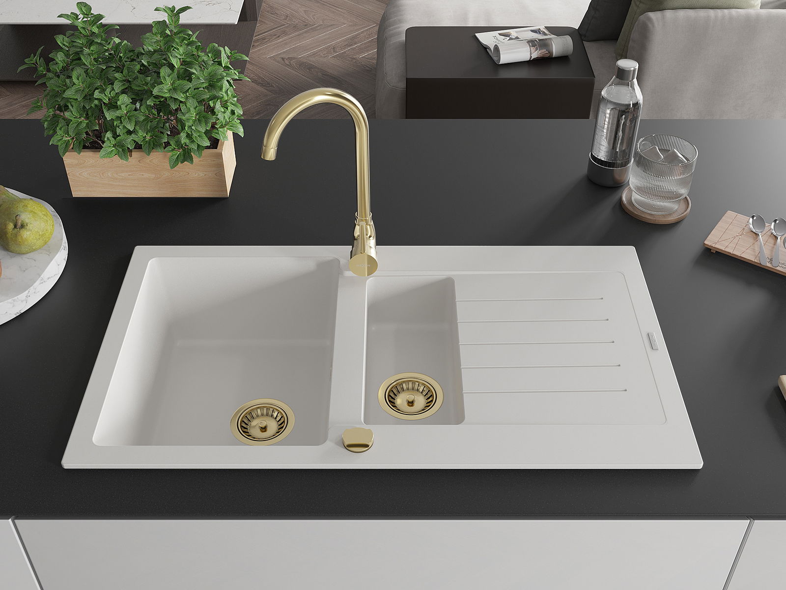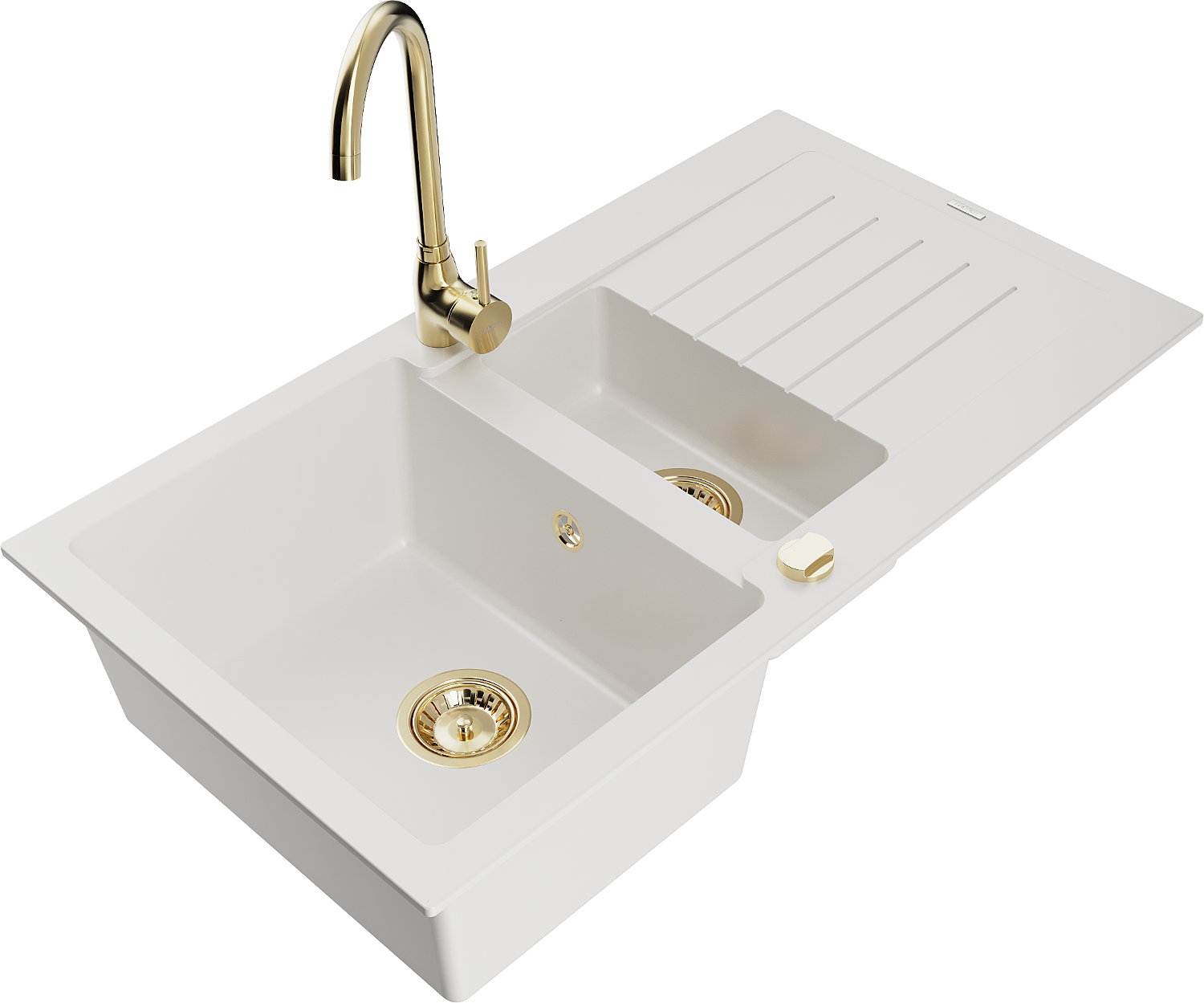Mexen Matias évier en granit 1,5 bac avec égouttoir et robinet de cuisine Telma, blanc - 6502-20-670200-50