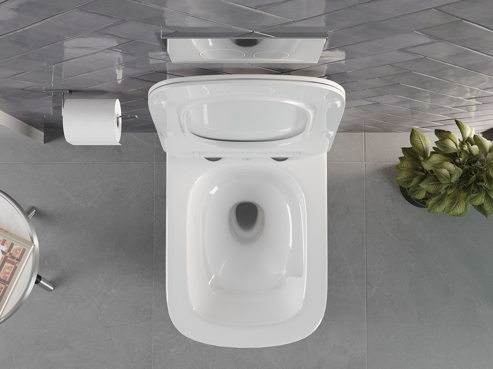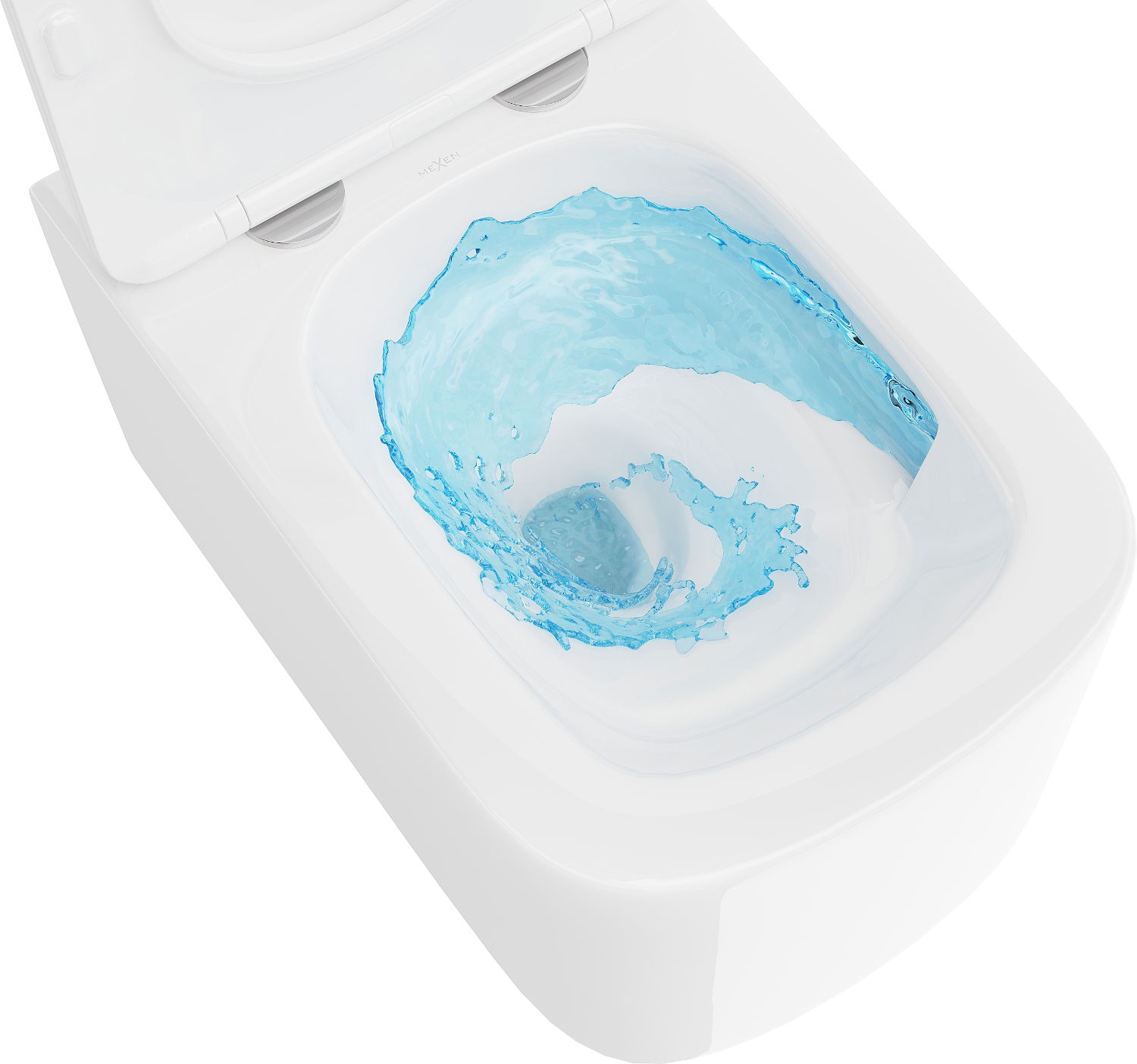 Système caractérisé par l'absence de rebord traditionnel (sans rebord) et un système de rinçage en spirale spécifique qui rappelle un tourbillon. L'eau de rinçage crée un effet "tornado", nettoyant rapidement et efficacement toute la surface de la cuvette, ce qui aide à mieux la purifier et empêche la saleté de s'y déposer.