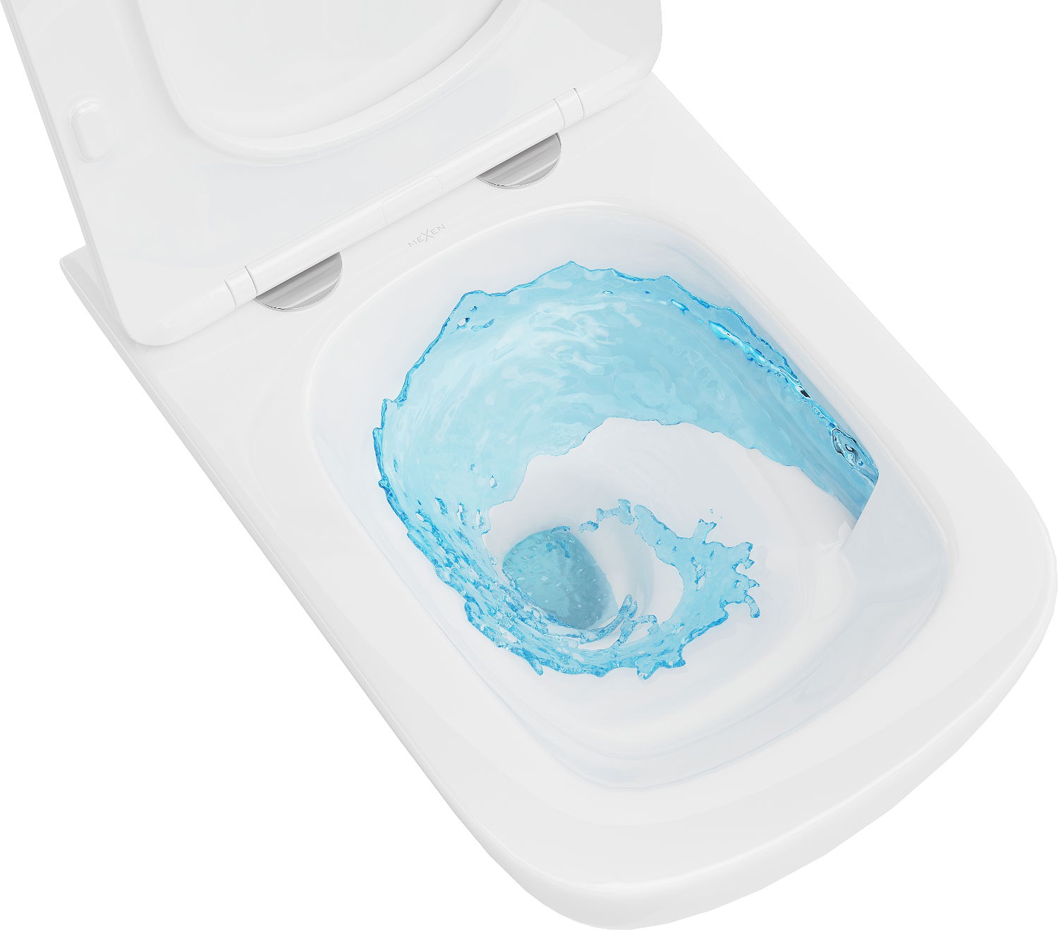 Système caractérisé par l'absence de rebord traditionnel (sans rebord) et un système de rinçage en spirale spécifique qui rappelle un tourbillon. L'eau de rinçage crée un effet "tornado", nettoyant rapidement et efficacement toute la surface de la cuvette, ce qui aide à mieux la purifier et empêche la saleté de s'y déposer.