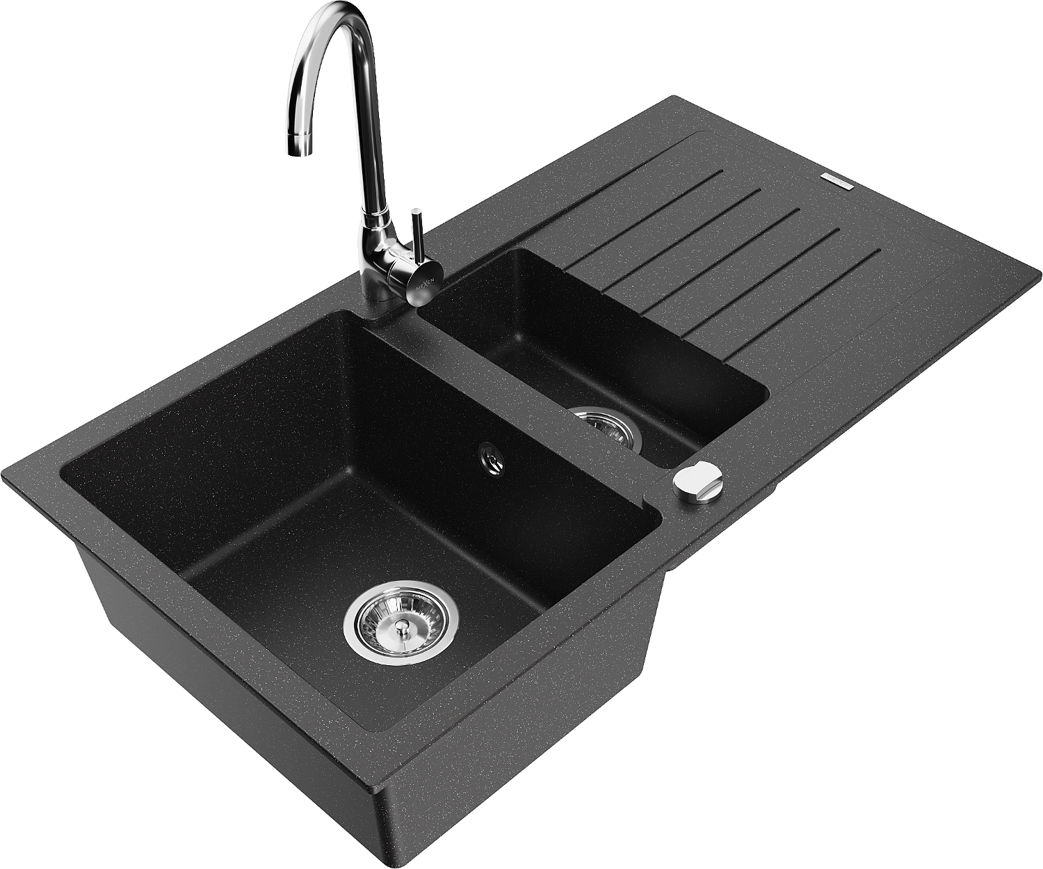Mexen Matias évier en granit 1,5 cuves avec égouttoir et robinet de cuisine Telma, noir/argent - 6502-73-670200-00
