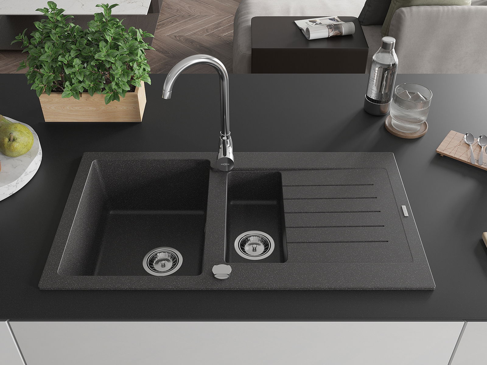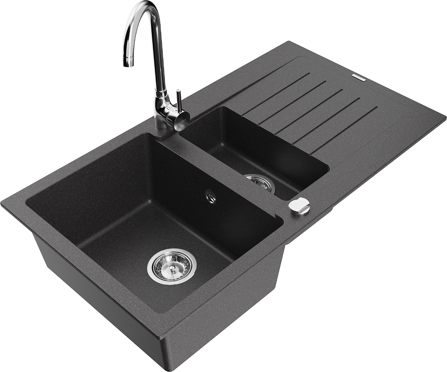 Mexen Matias évier de cuisine en granit 1,5 bac avec égouttoir et mitigeur Telma, noir moucheté - 6502-76-670200-00