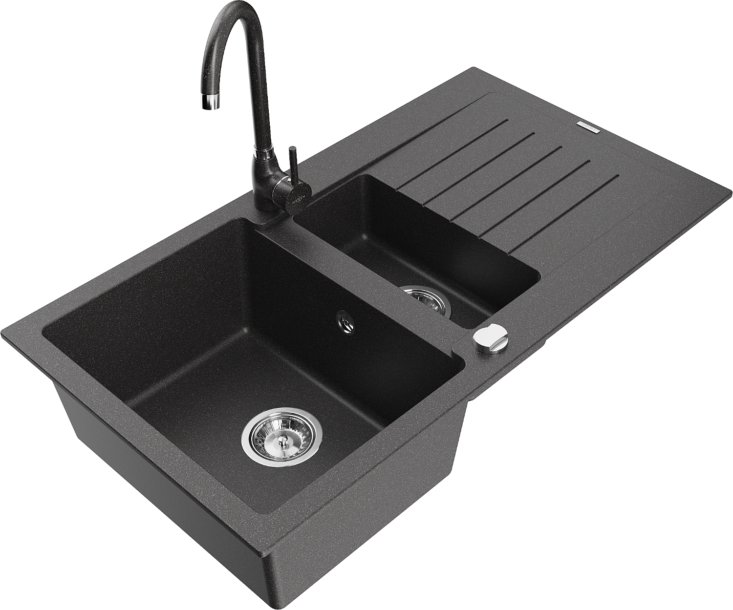 Mexen Matias évier en granit 1,5 bac avec égouttoir et robinet de cuisine Telma, noir moucheté - 6502-76-670200-76