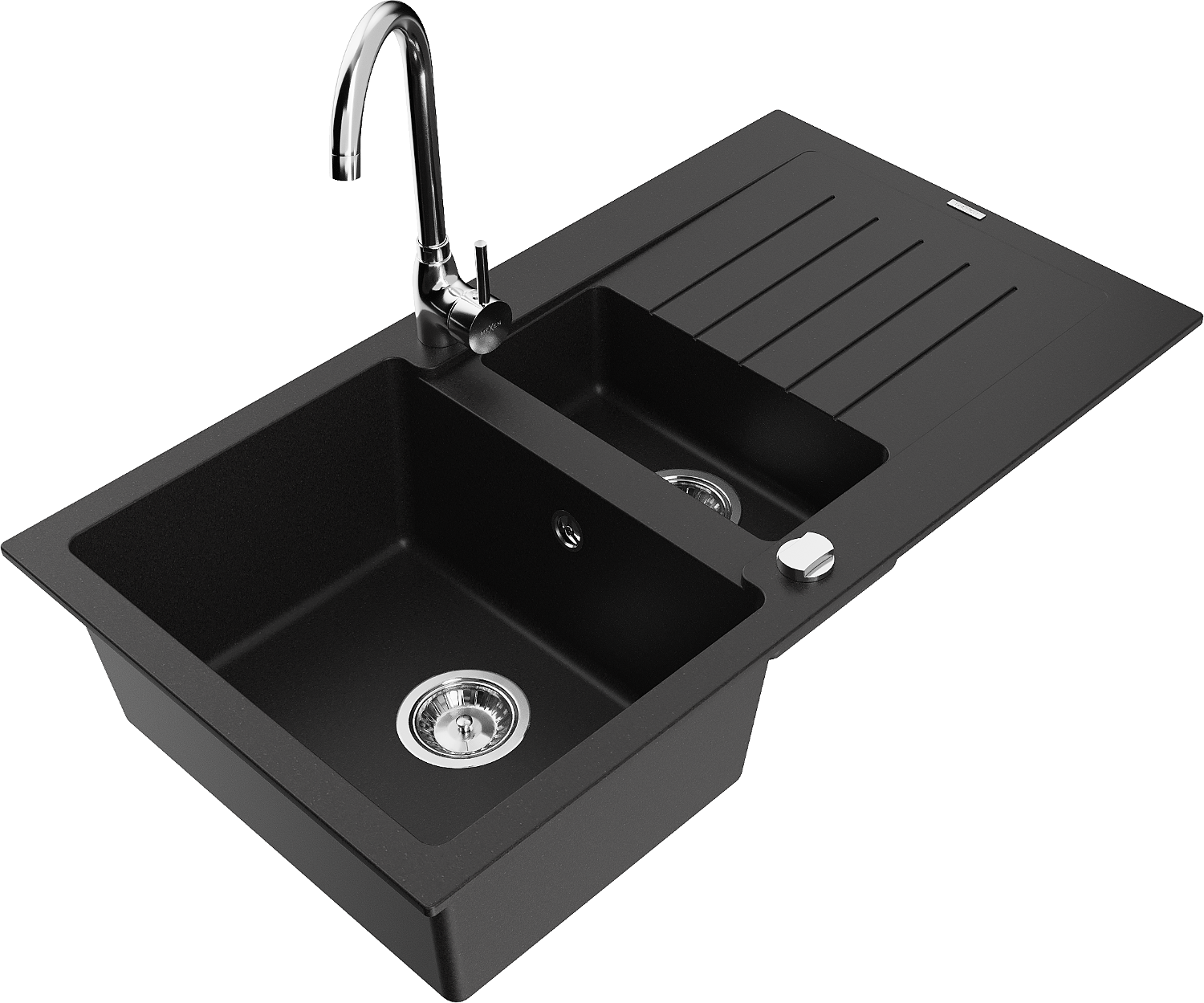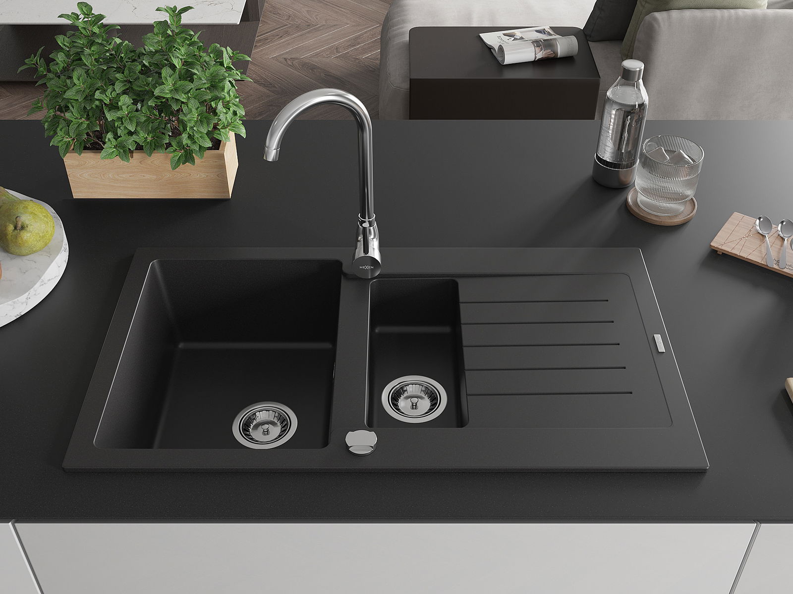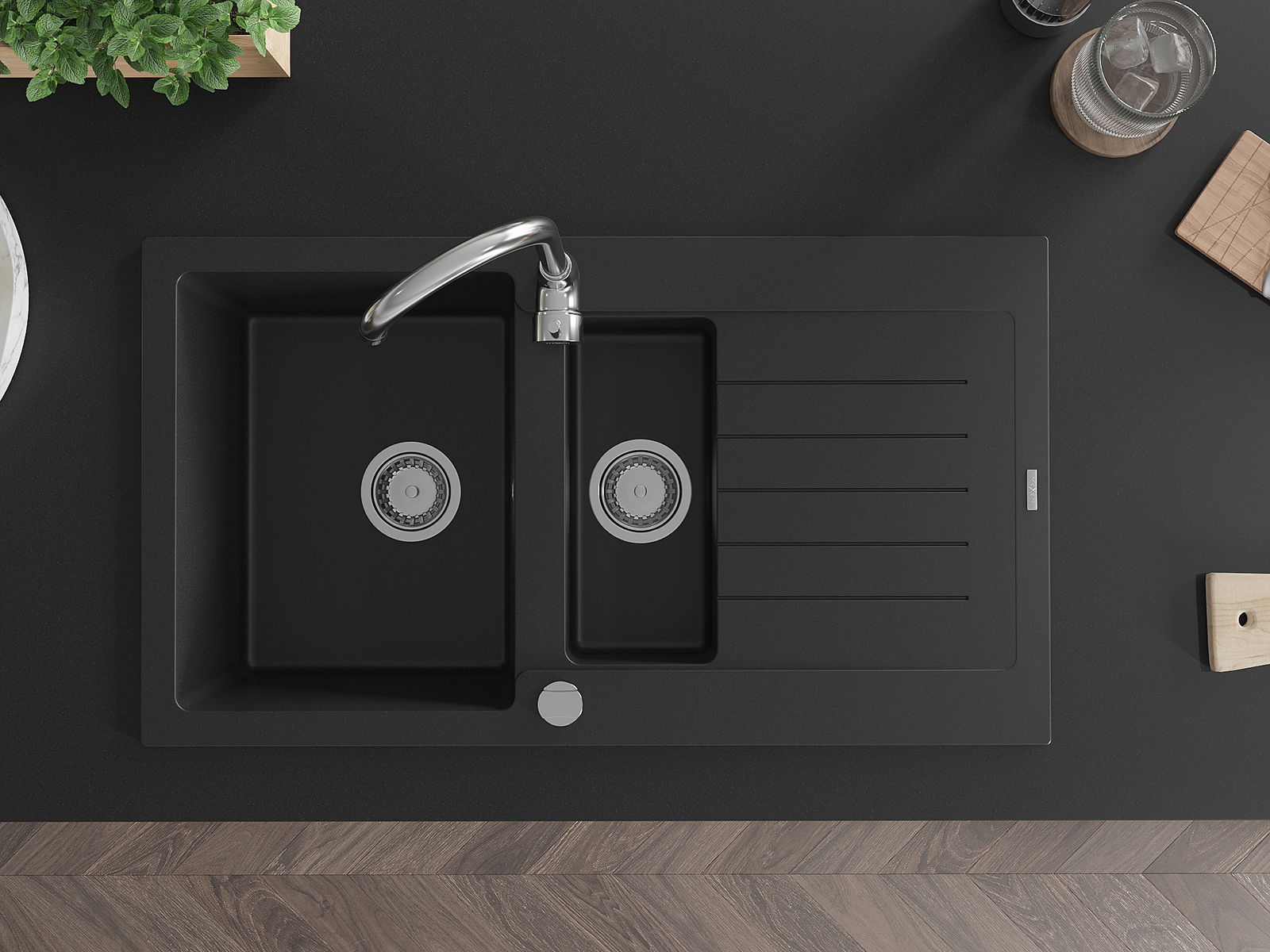Mexen Matias évier en granit 1,5 bac avec égouttoir et mitigeur cuisine Telma, noir - 6502-77-670200-00