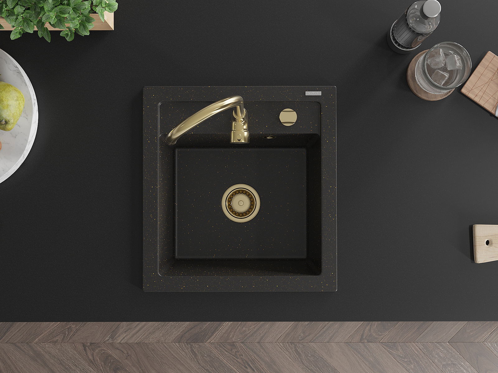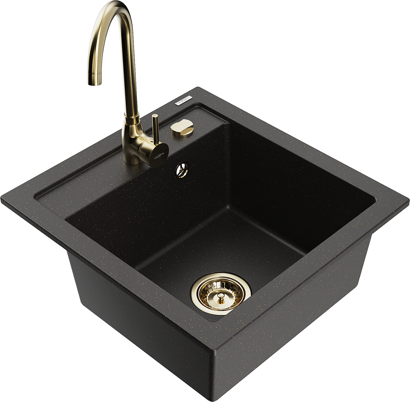 Mexen Vito évier en granit 1 bac avec robinet de cuisine Telma, noir/doré métallique - 6503-75-670200-50
