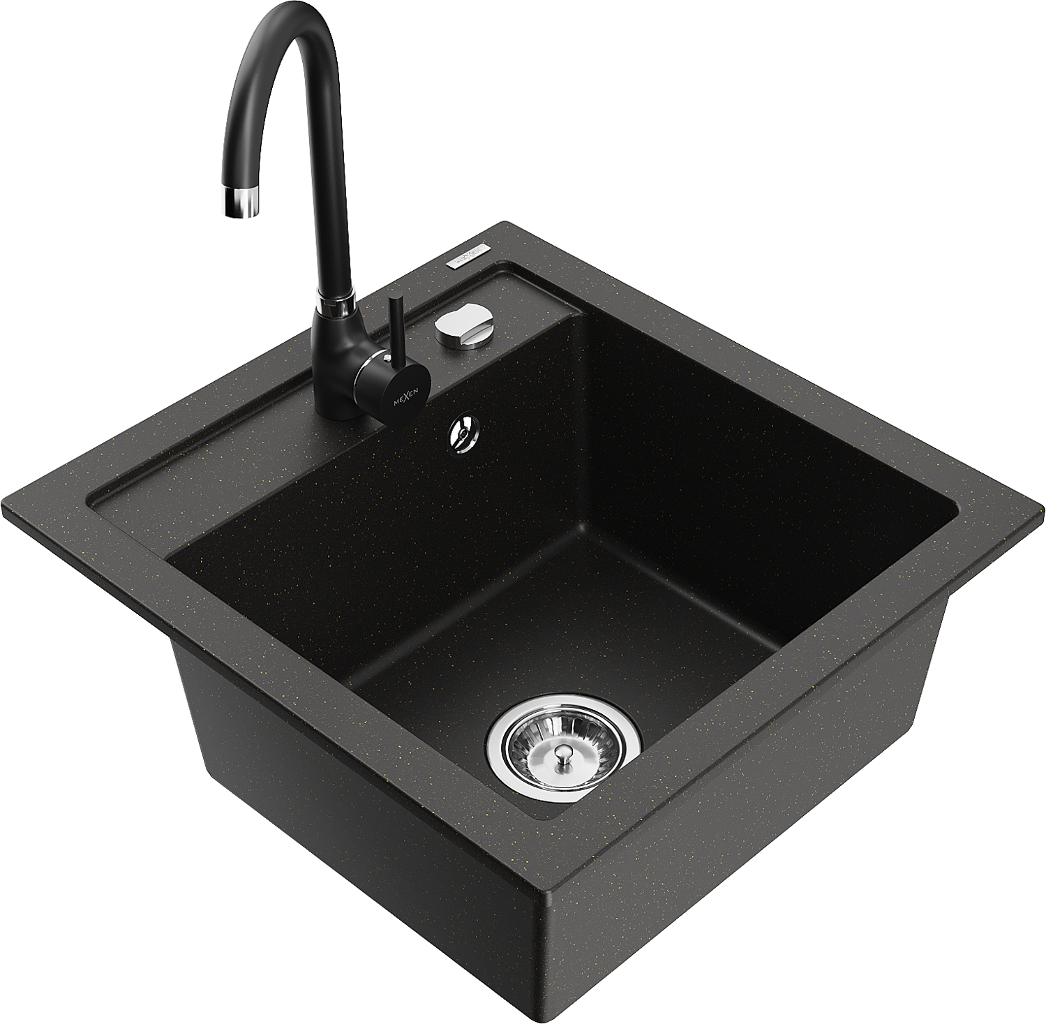 Mexen Vito évier en granit 1 bac avec mitigeur de cuisine Telma, noir/doré métallique - 6503-75-670200-70