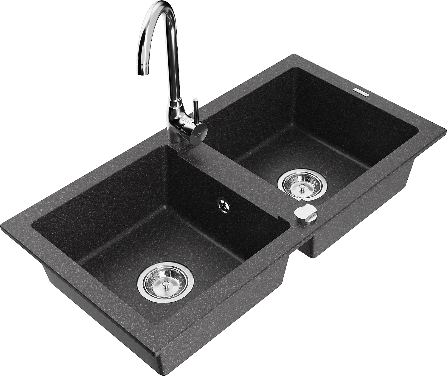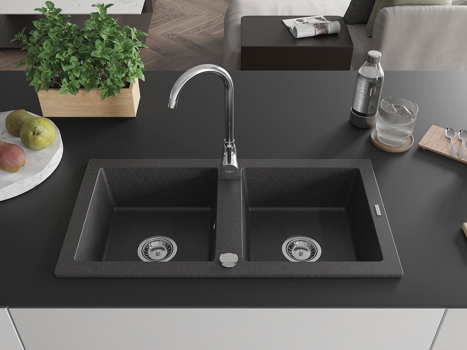 Mexen Mario évier en granit 2 bacs avec robinet de cuisine Telma, noir moucheté - 6504-76-670200-00