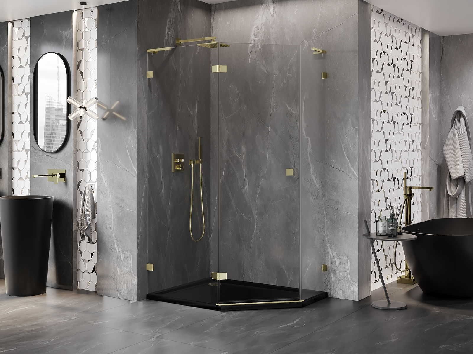 Mexen Lunar L cabine de douche pentagonale pivotante gauche 100 x 80 cm, transparent, doré - 831L-100L-080P-50-00-L