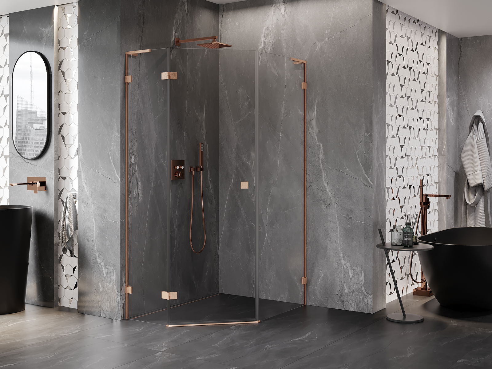 Mexen Lunar L cabine de douche pentagonale pivotante gauche 80 x 90 cm, transparent, cuivre brossé - 831L-080L-090P-65-00-L