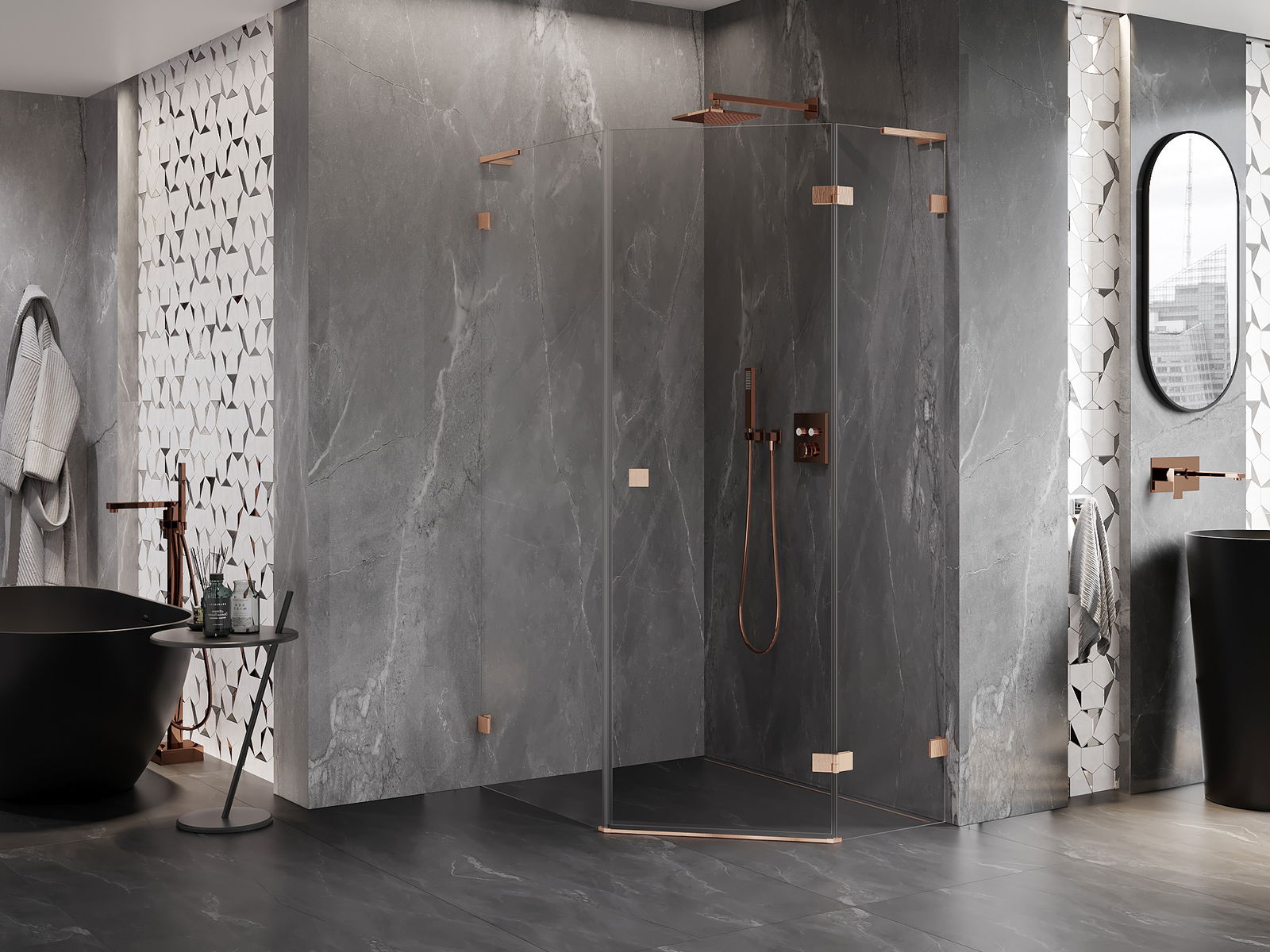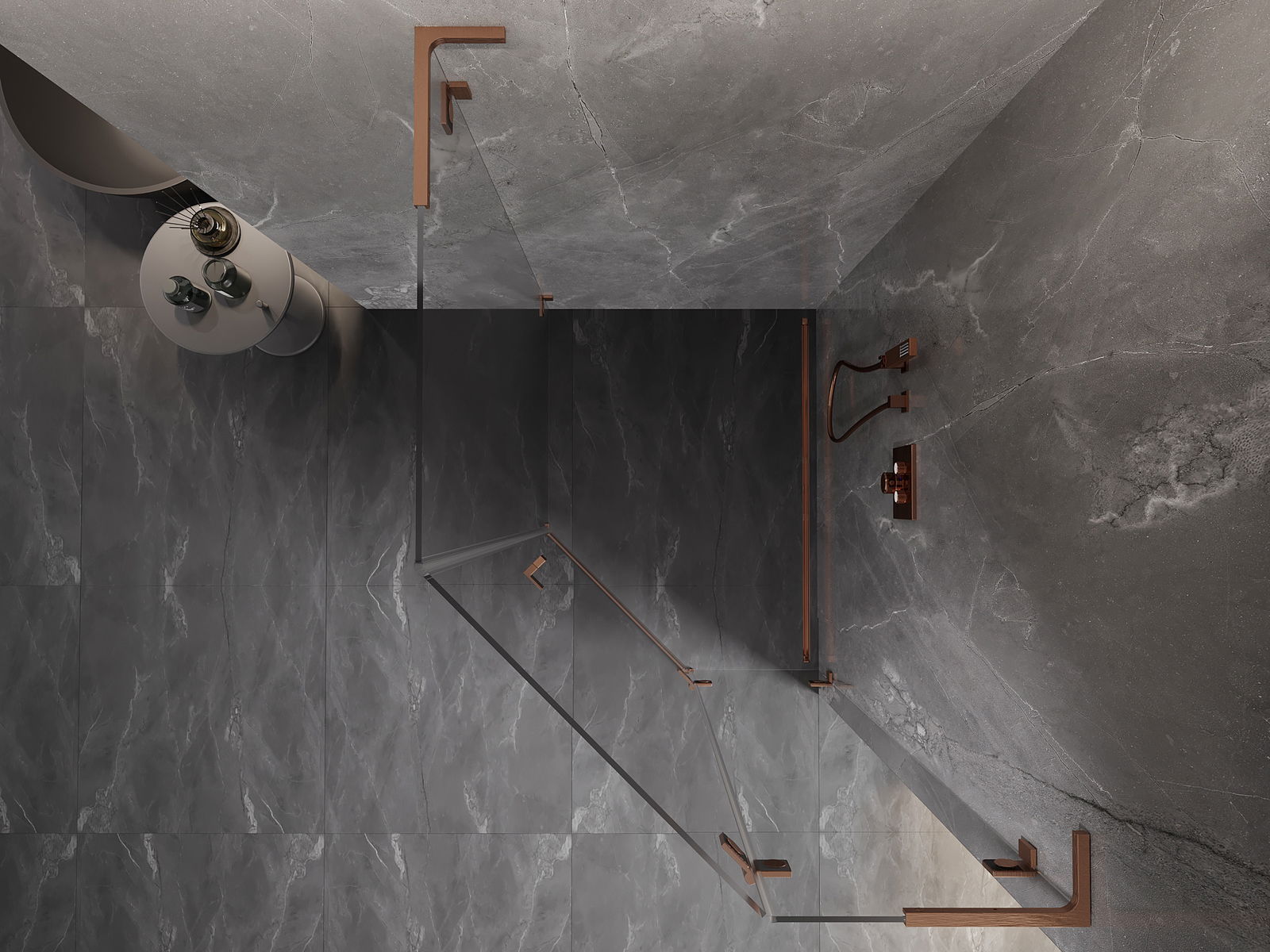 Mexen Lunar L cabine de douche pentagonale pivotante droite 90 x 100 cm, transparent, cuivre brossé - 831L-090P-100L-65-00-P
