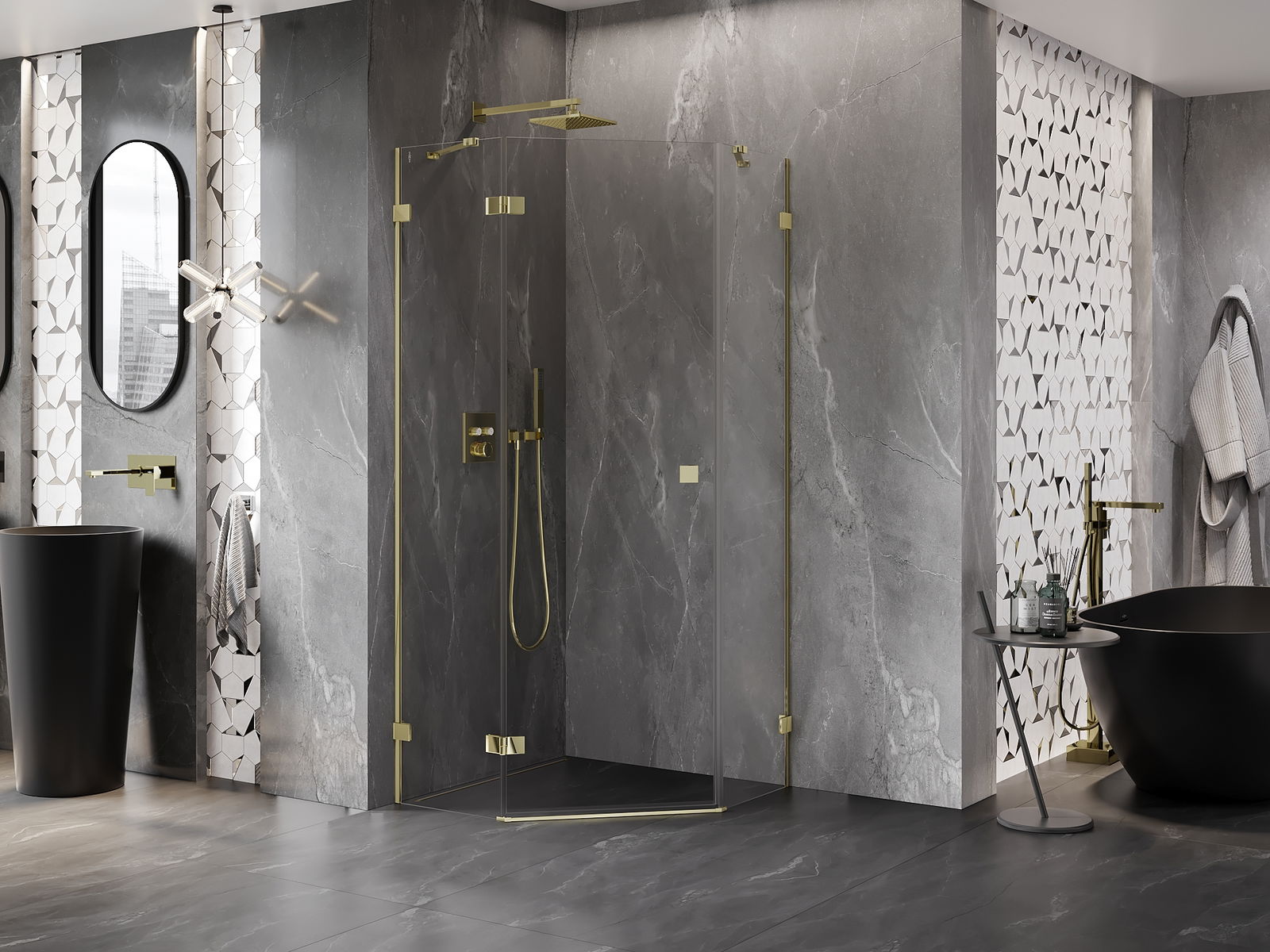 Mexen Lunar cabine de douche pentagonale pivotante gauche 90 x 90 cm, transparente, dorée - 831-090L-090P-50-00-L
