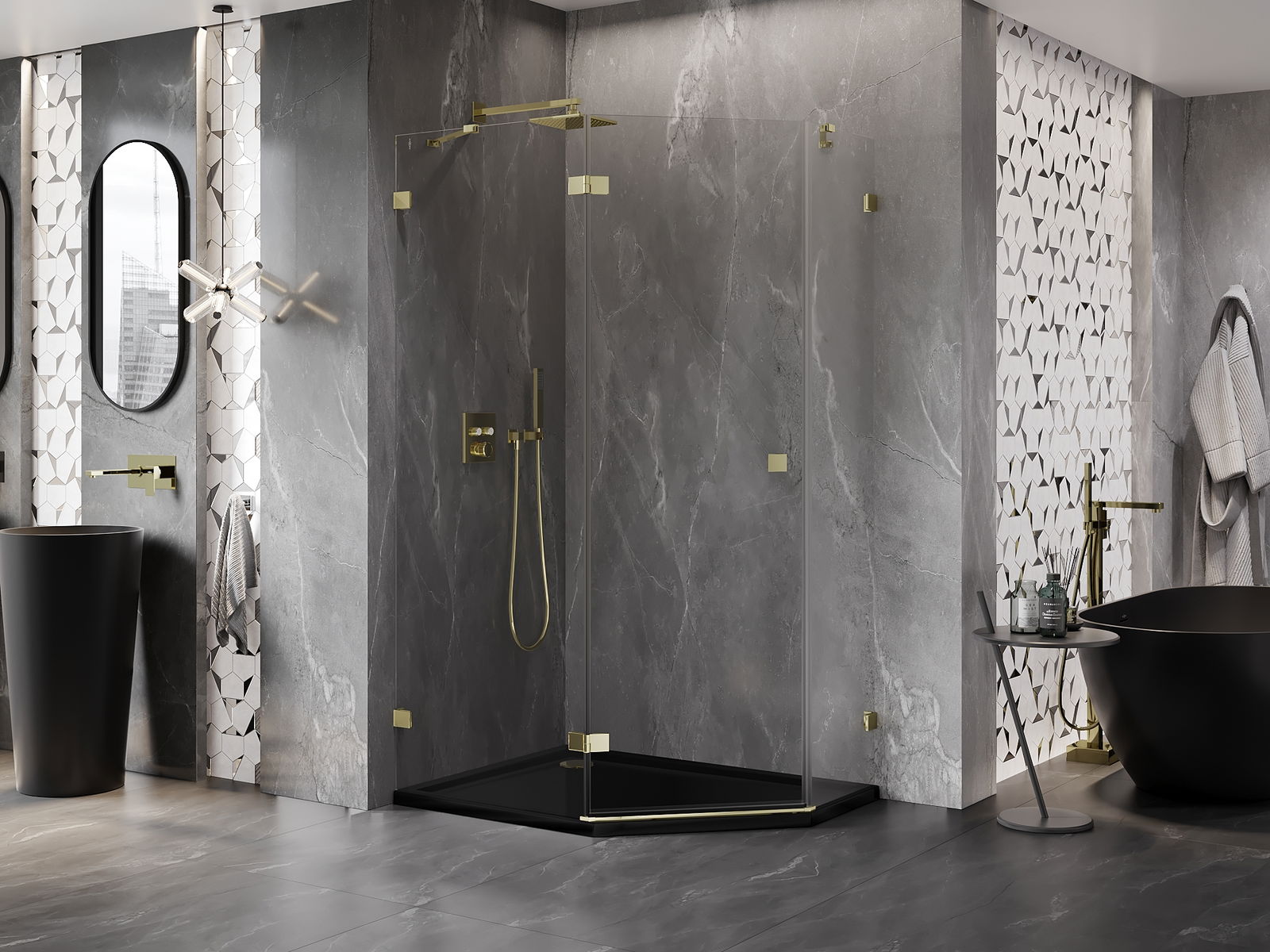 Mexen Lunar cabine de douche pentagonale pivotante gauche 100 x 90 cm, transparente, or - 831-100L-090P-50-00-L
