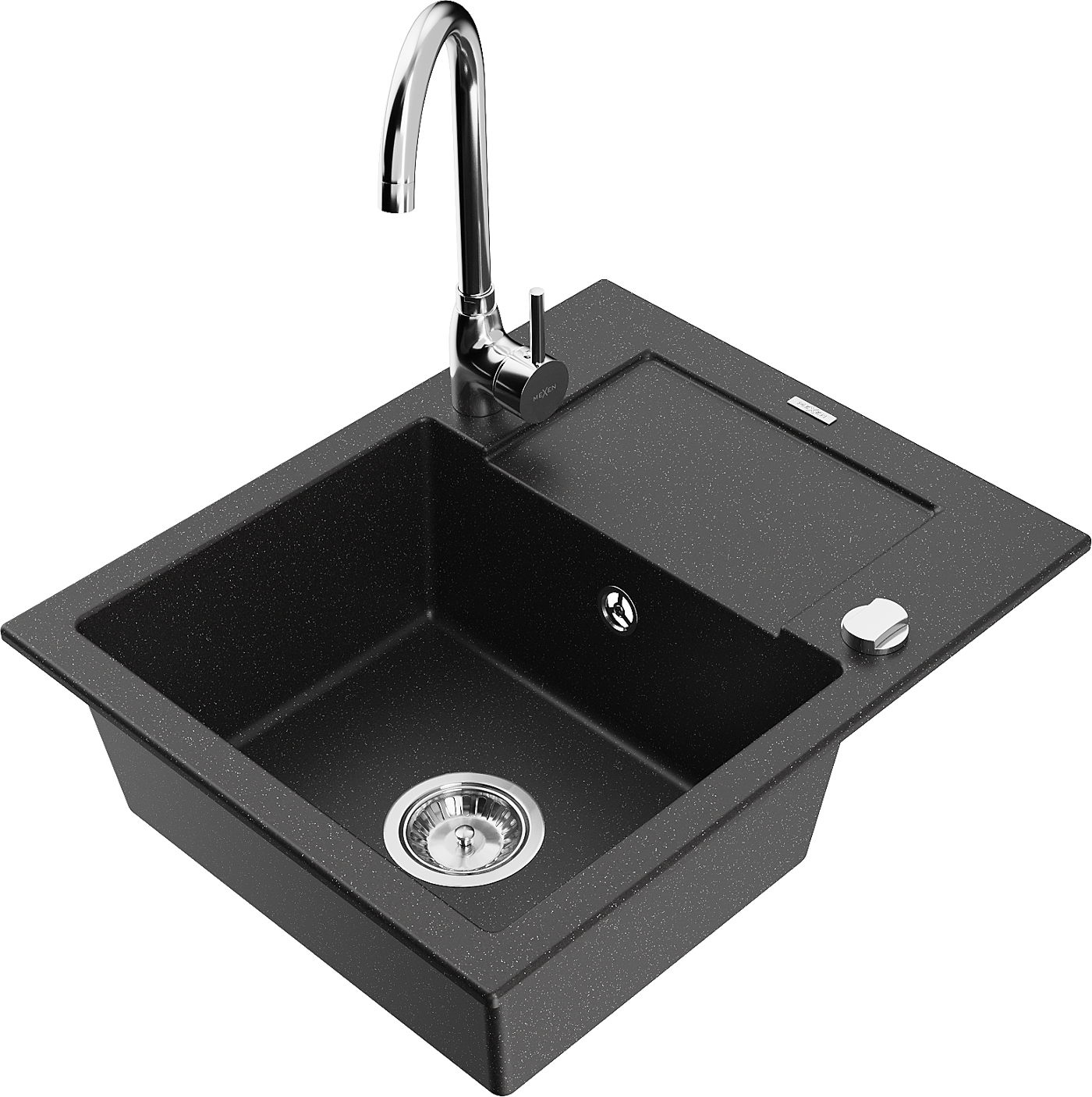 Mexen Enzo évier en granit 1 bac avec égouttoir et robinet de cuisine Telma, noir/argenté - 6506-73-670200-00