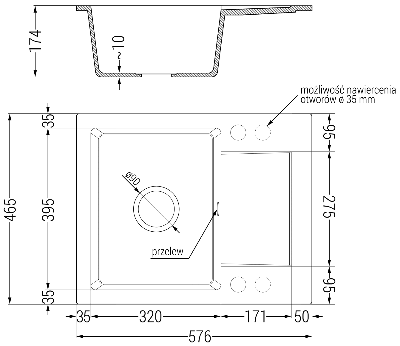 L'évier est doté de deux trous fraisés de 35 mm de diamètre, auto-perforables. Ils permettent notamment d'installer un distributeur de liquide, ce qui éliminera les bouteilles en plastique dans la cuisine et lui apportera une finition élégante.