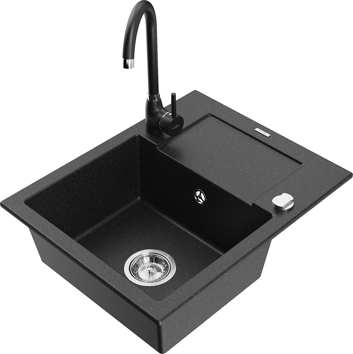 Mexen Enzo évier en granit à 1 bac avec égouttoir et robinet de cuisine Telma, noir/argent - 6506-73-670200-70
