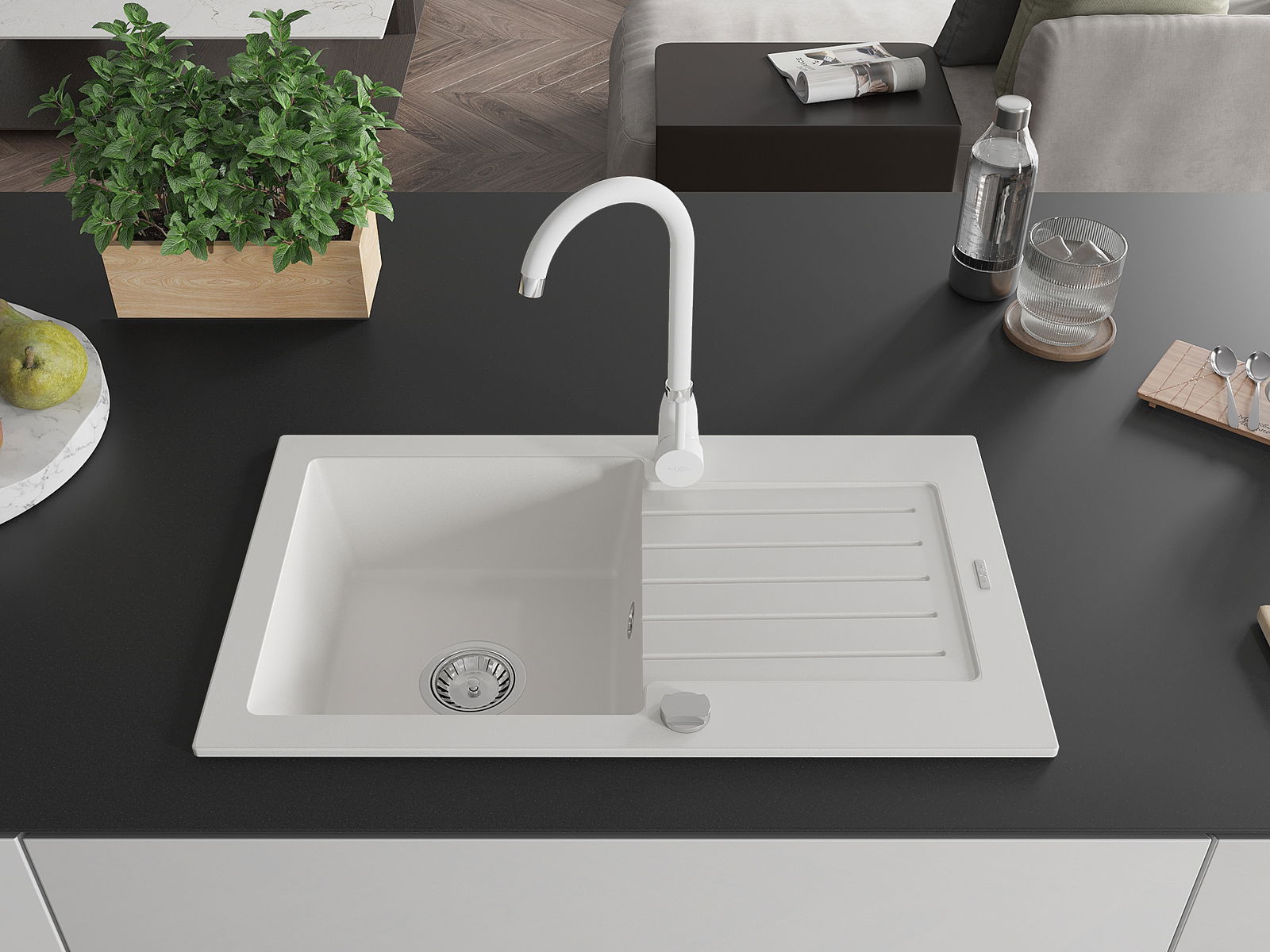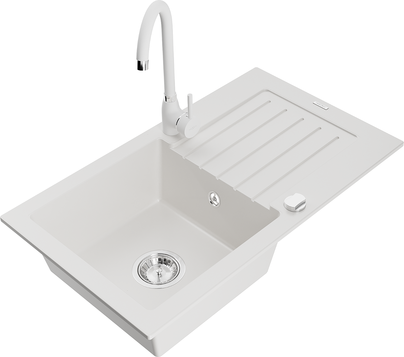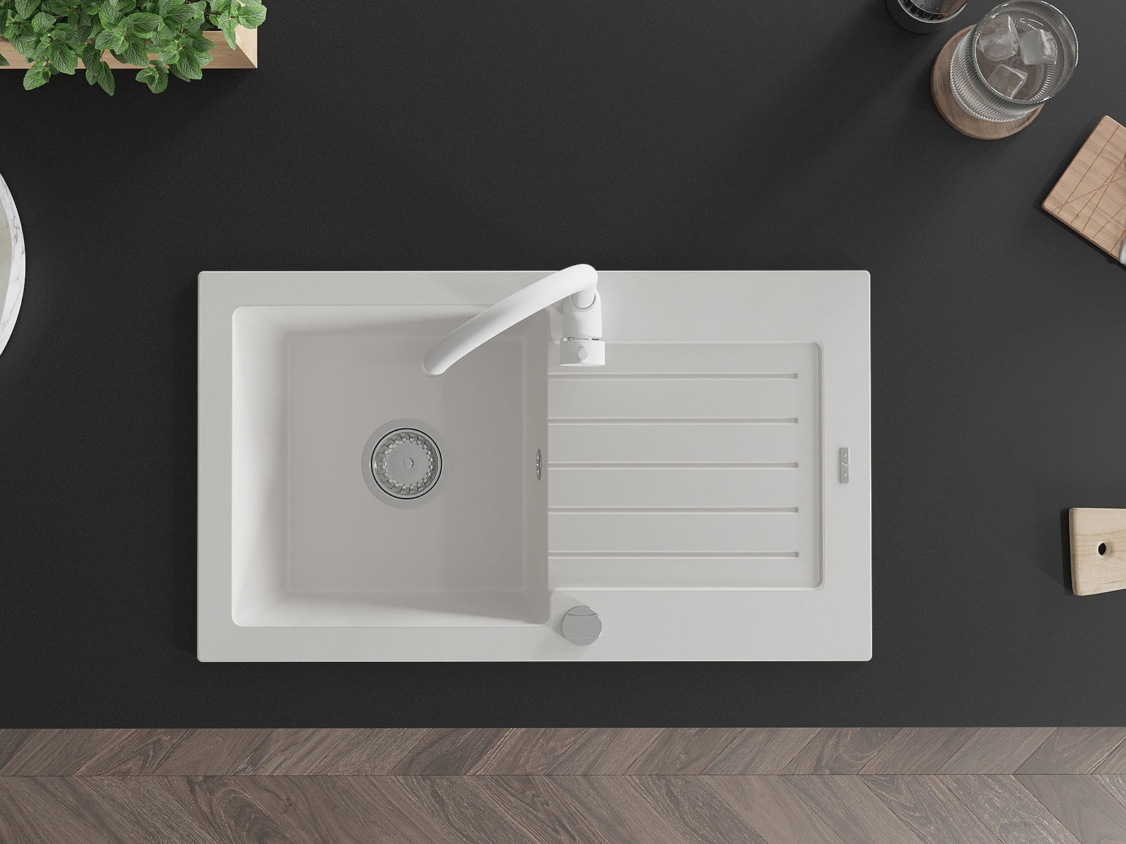 Mexen Pablo évier en granit 1 bac avec égouttoir et mitigeur de cuisine Telma, blanc - 6510-20-670200-20