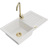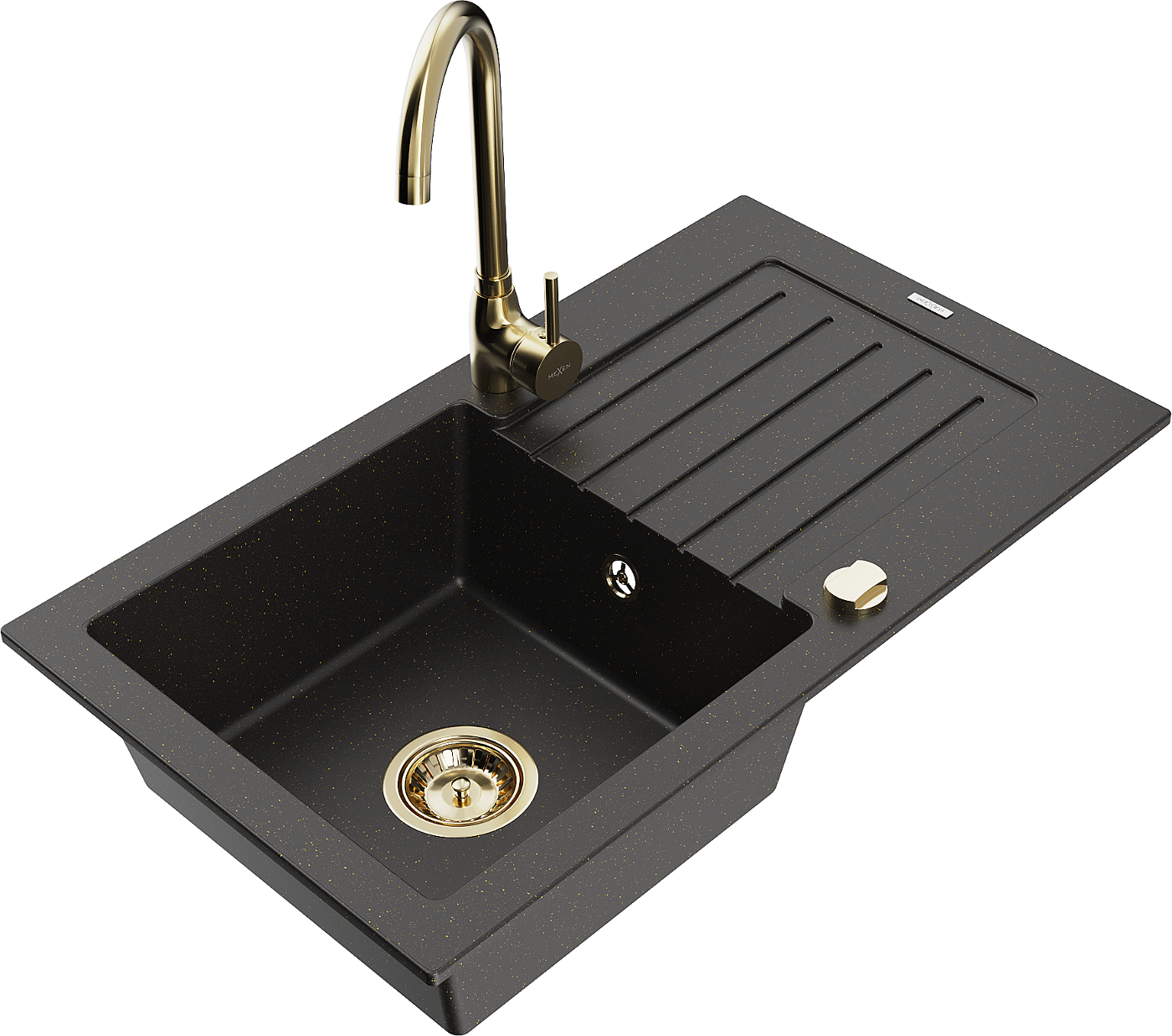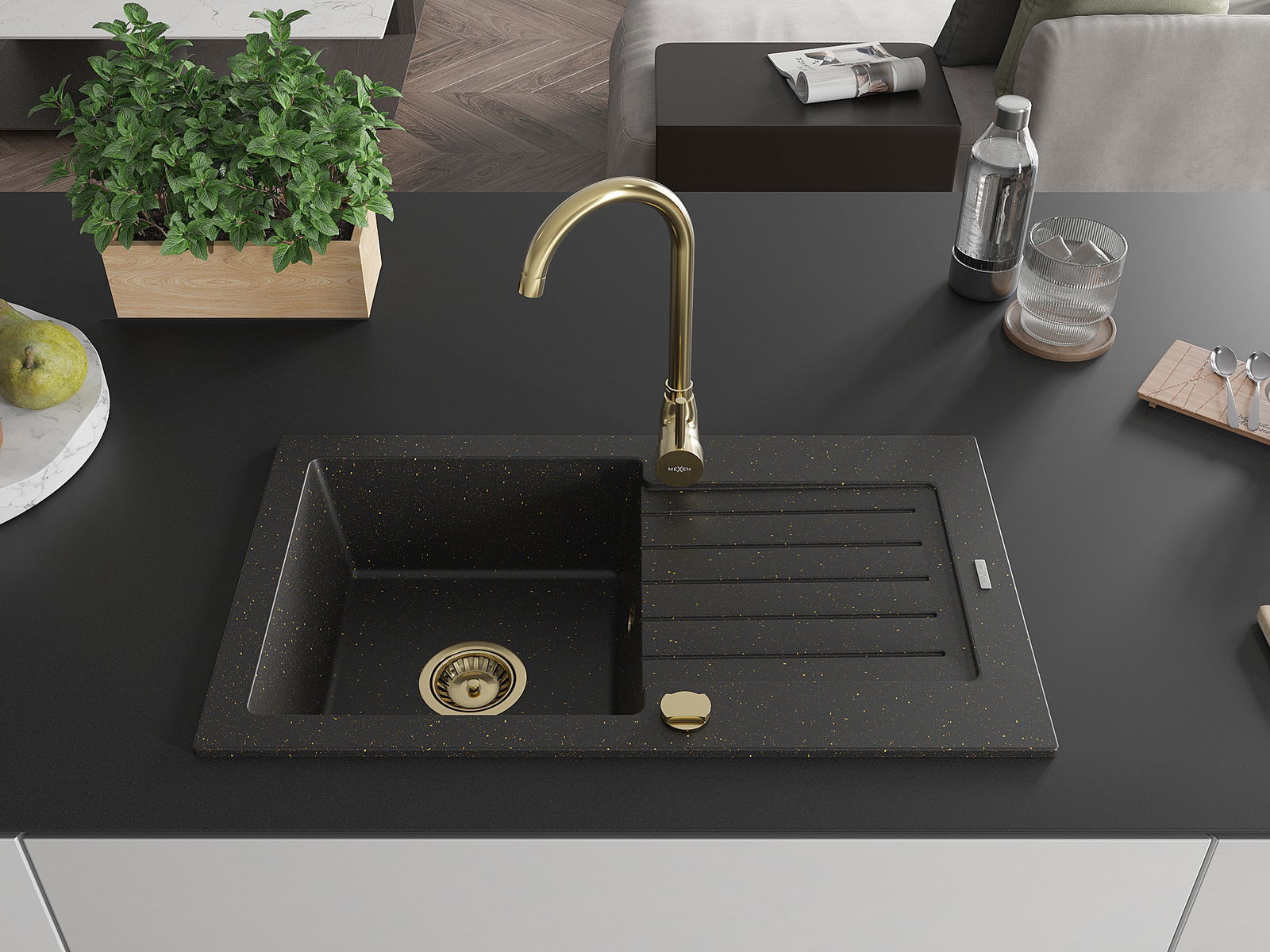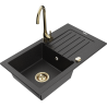 Mexen Pablo évier en granit 1 bac avec égouttoir et robinet de cuisine Telma, noir/or - 6510-75-670200-50