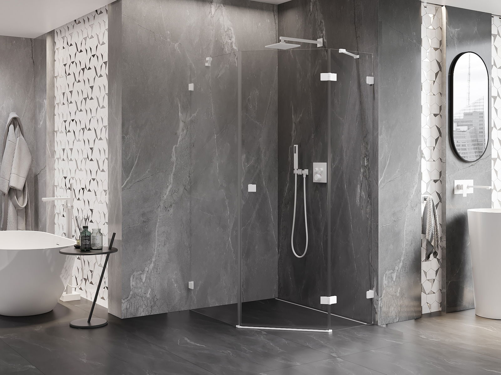 La poignée pratique et confortable est fabriquée en métal durable et résistant. Sa forme à la mode, combinée à une finition assortie à la couleur des profilés, donne à l'ensemble un aspect moderne et stylé, soulignant l'esthétique de chaque salle de bain.