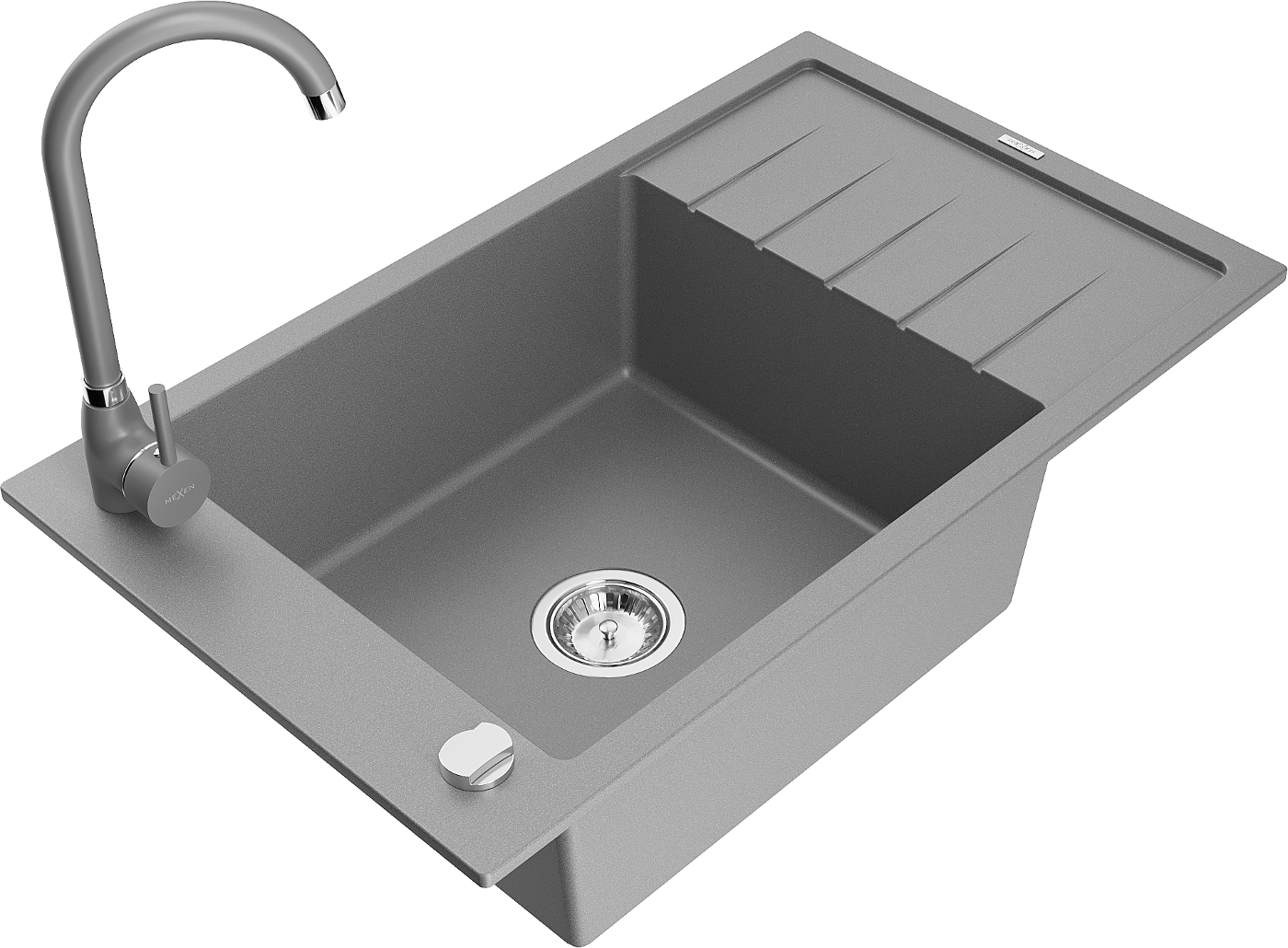 Mexen Elias évier en granit à 1 bac avec égouttoir et robinet de cuisine Telma, gris - 6511-71-670200-71
