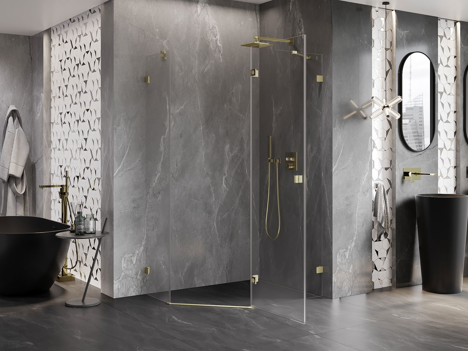 Mexen Lunar cabine de douche pentagonale pivotante droite 100 x 80 cm, transparente, or brossé - 831-100P-080L-55-00-P