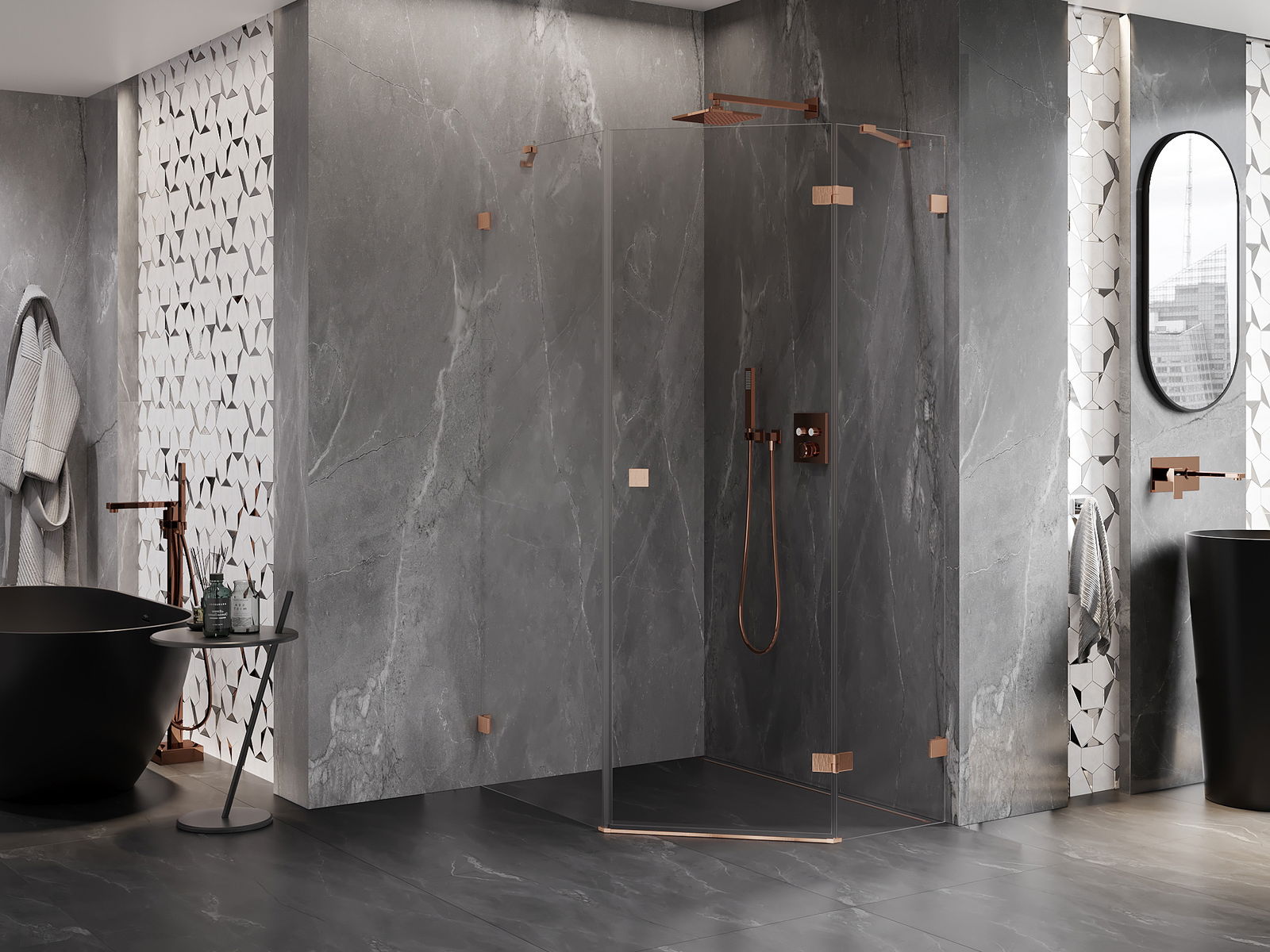 Mexen Lunar cabine de douche pentagonale à charnière droite 80 x 90 cm, transparent, cuivre brossé - 831-080P-090L-65-00-P