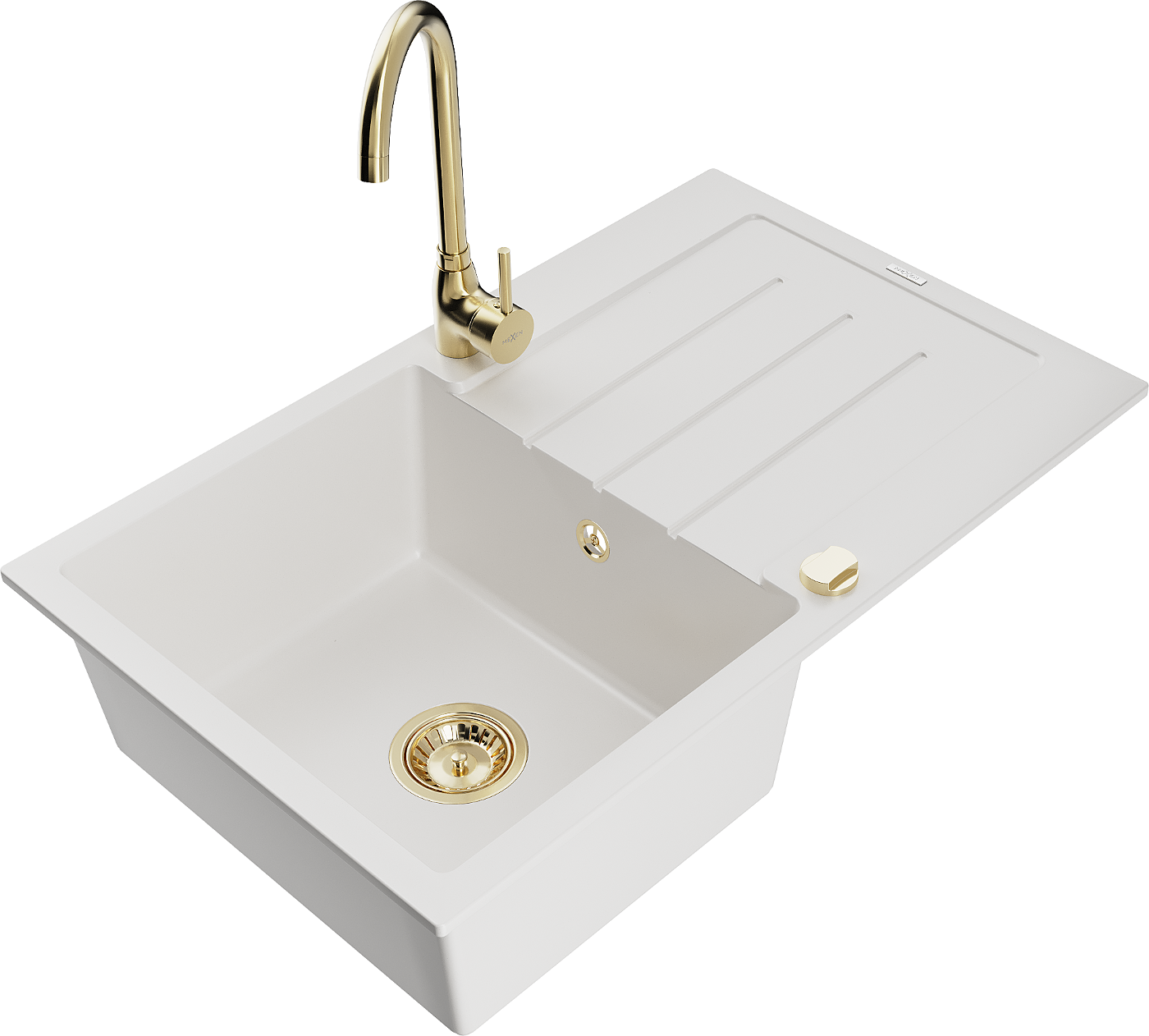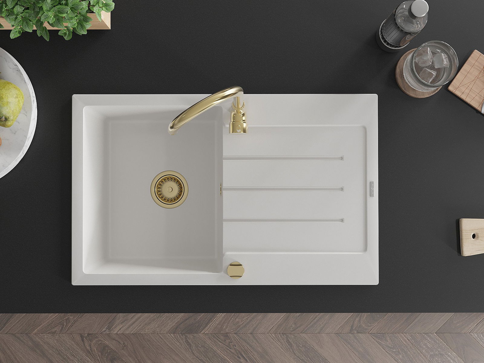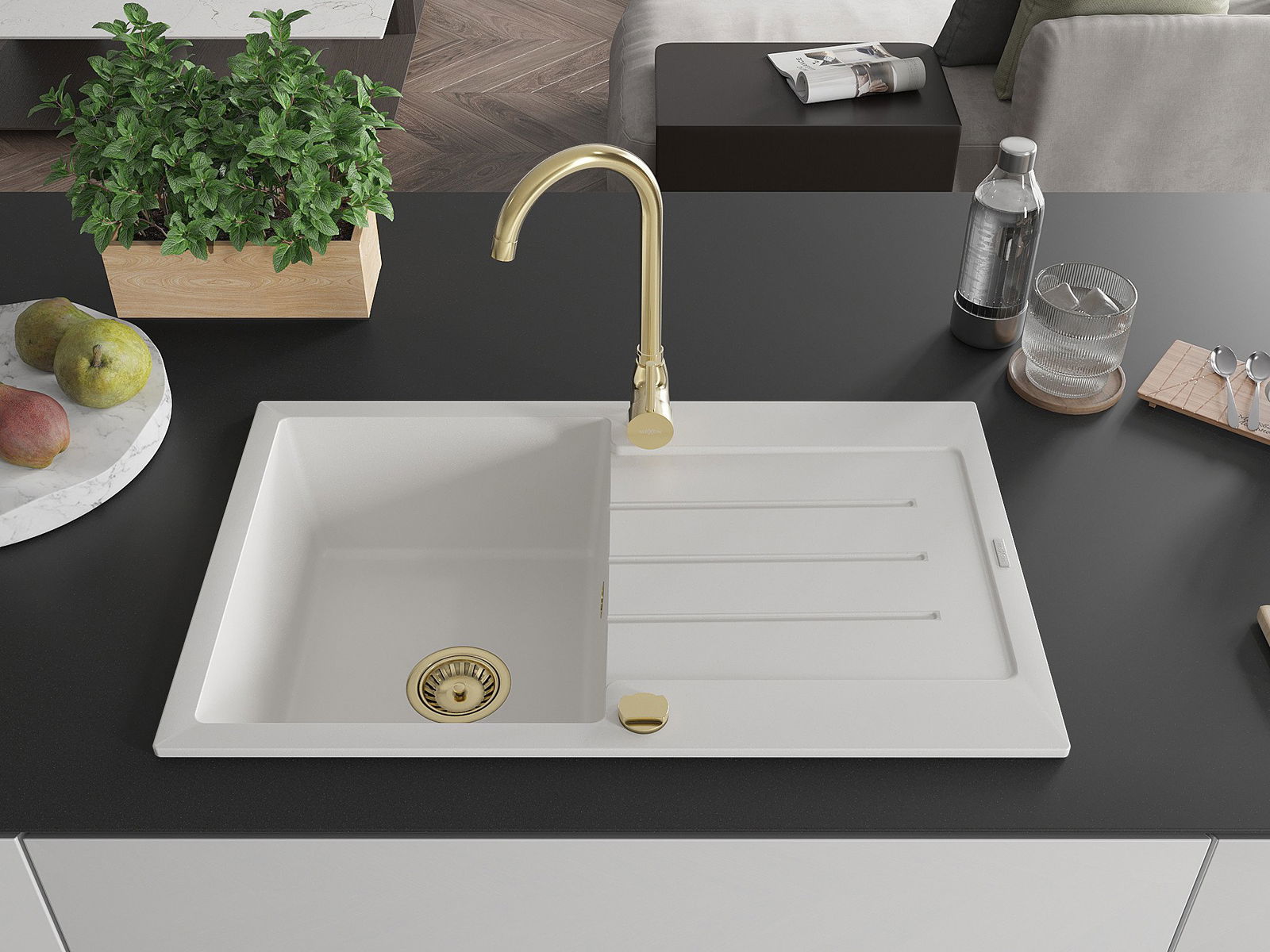 Mexen Bruno évier en granit 1 bac avec égouttoir et robinet de cuisine Telma, blanc - 6513-20-670200-50