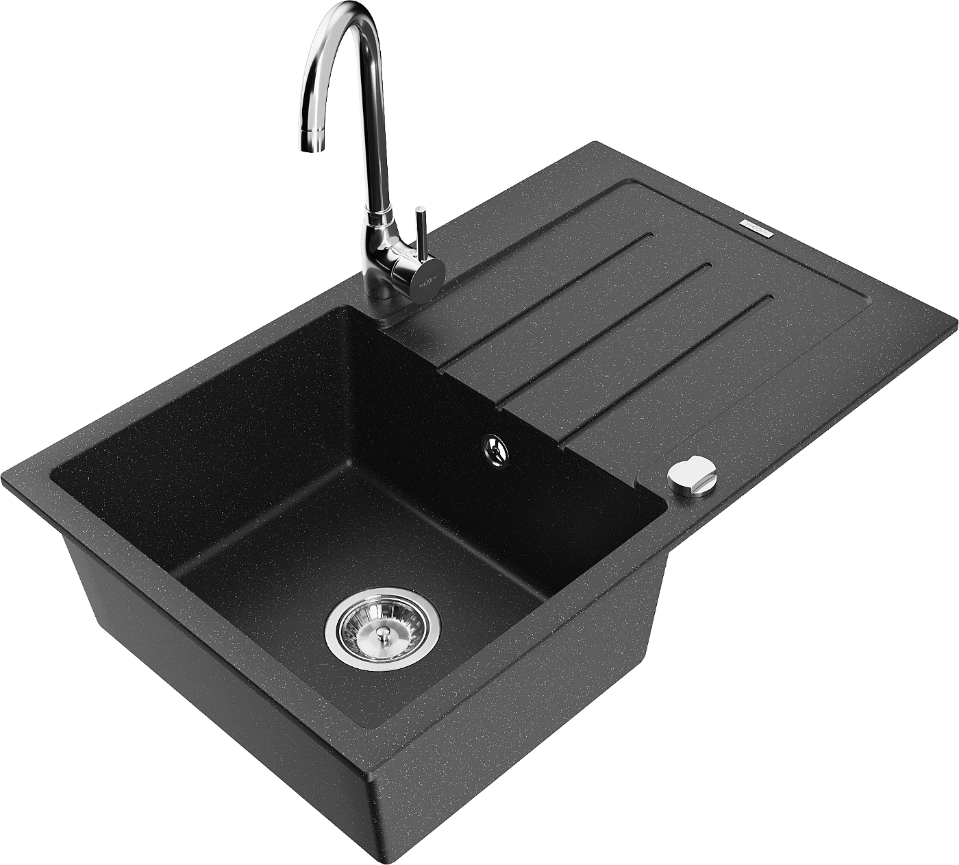 Mexen Bruno évier de cuisine en granit 1 bac avec égouttoir et robinet de cuisine Telma, noir/argent - 6513-73-670200-00