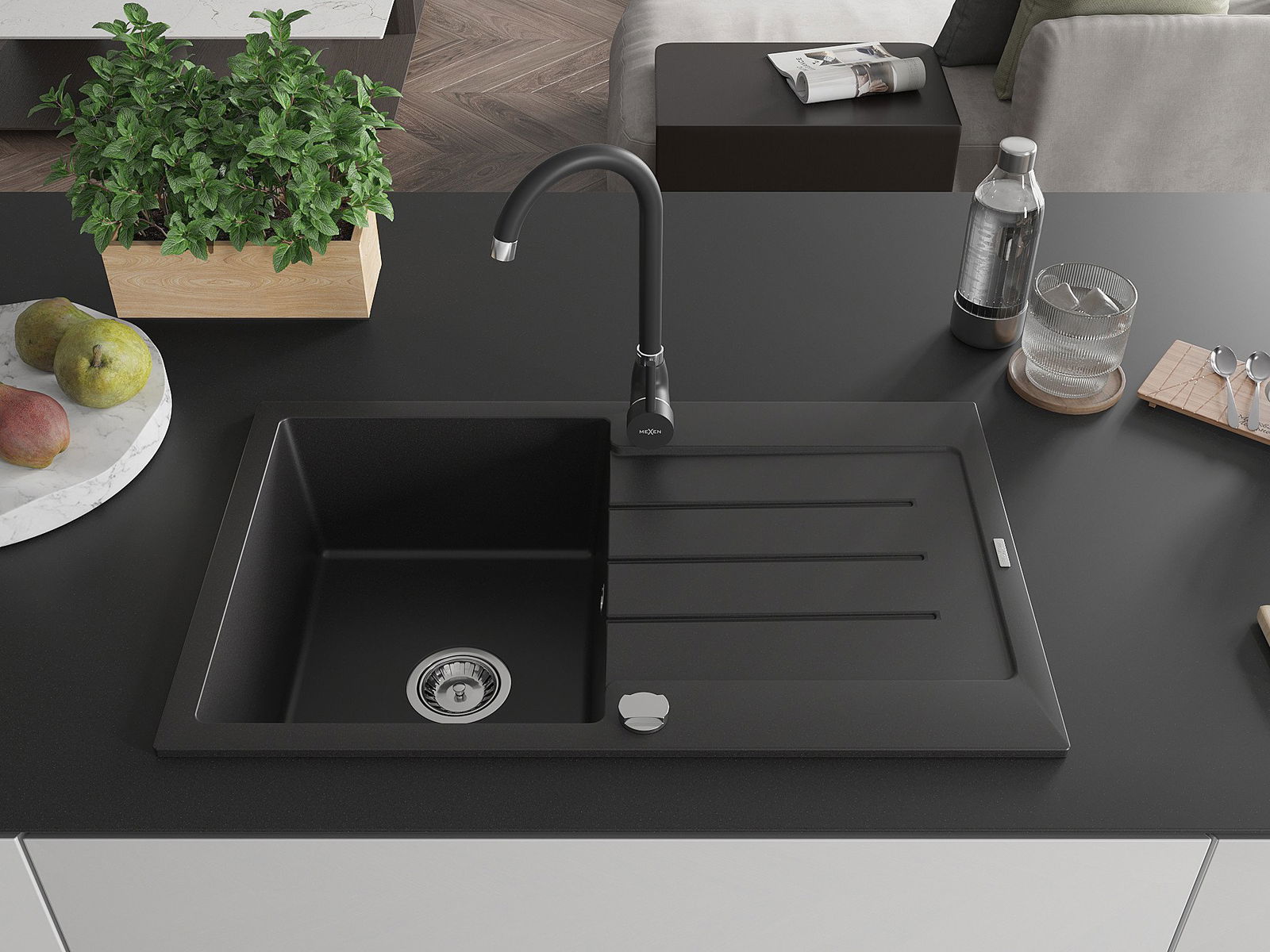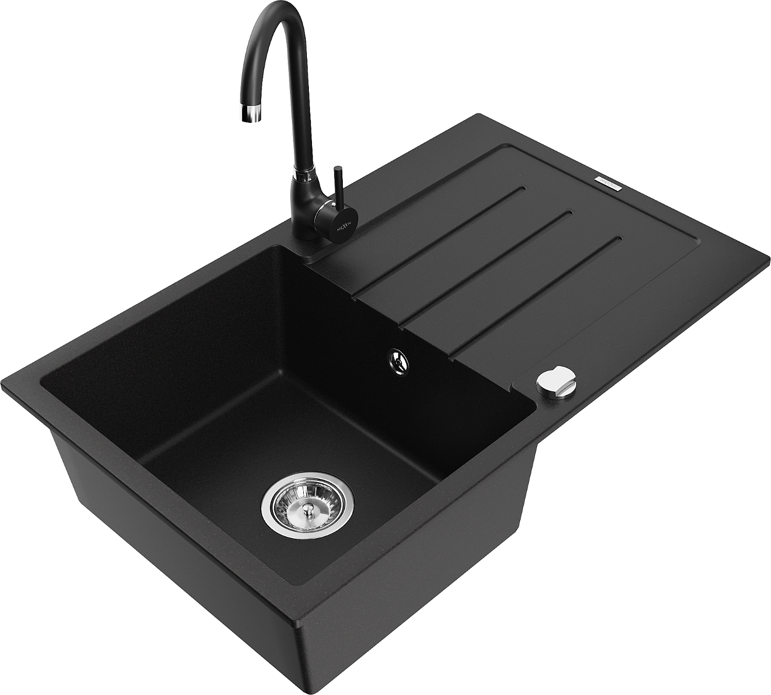 Mexen Bruno évier en granit 1 bac avec égouttoir et robinet de cuisine Telma, noir - 6513-77-670200-70