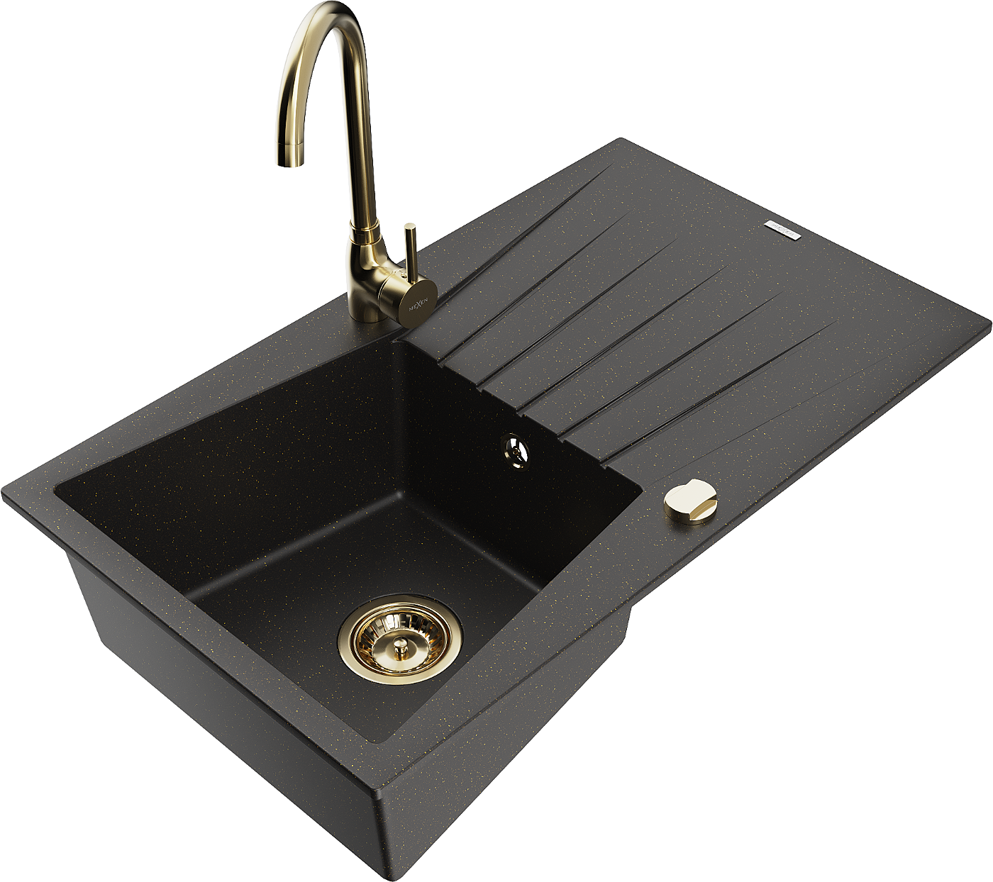 Mexen Cesar évier de cuisine en granit 1 bac avec égouttoir et robinet de cuisine Telma, noir/or - 6514-75-670200-50