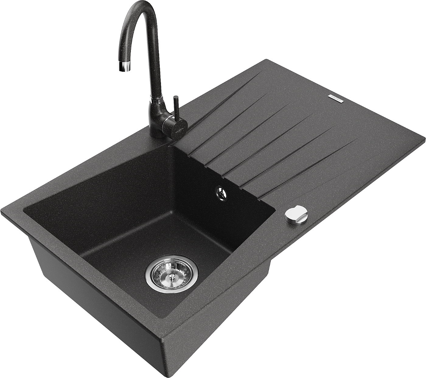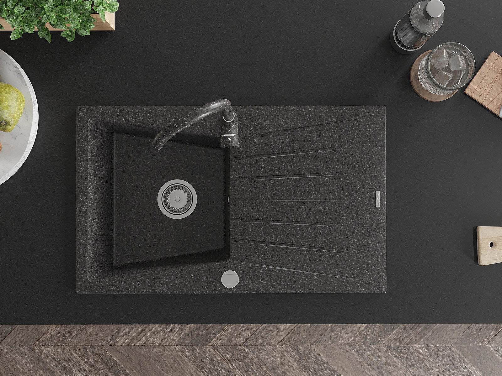 Mexen Cesar évier en granit 1 bac avec égouttoir et robinet de cuisine Telma, noir moucheté - 6514-76-670200-76