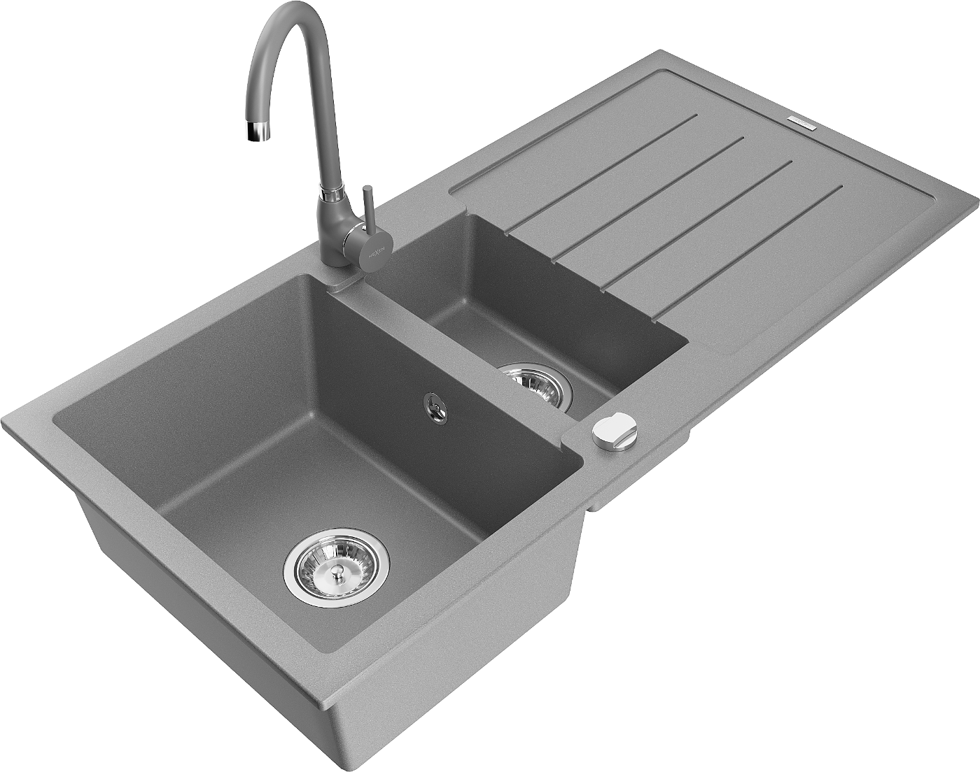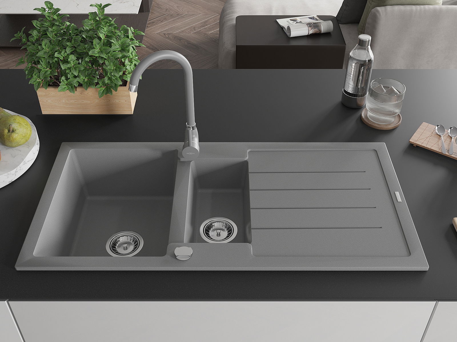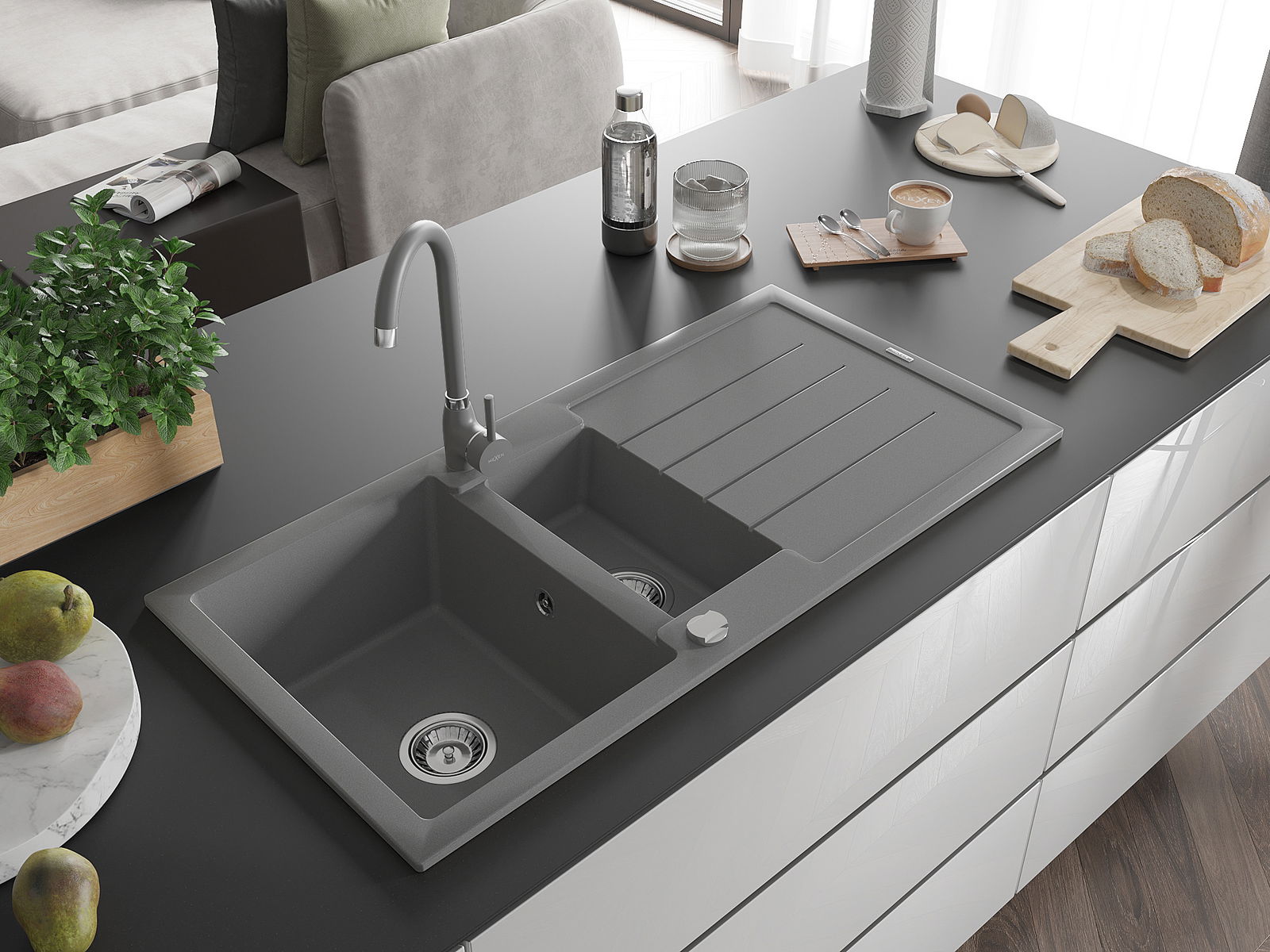 Mexen Andres évier en granit 1,5 bac avec égouttoir et robinet de cuisine Telma, gris - 6515-71-670200-71