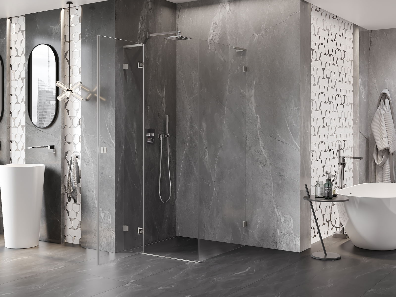 La poignée pratique et confortable est fabriquée en métal durable et résistant. Sa forme à la mode, combinée à une finition assortie à la couleur des profilés, donne à l'ensemble un aspect moderne et stylé, soulignant l'esthétique de chaque salle de bain.