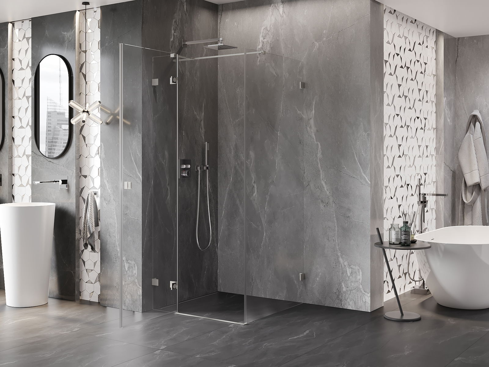 La poignée pratique et confortable est fabriquée en métal durable et résistant. Sa forme à la mode, combinée à une finition assortie à la couleur des profilés, donne à l'ensemble un aspect moderne et stylé, soulignant l'esthétique de chaque salle de bain.