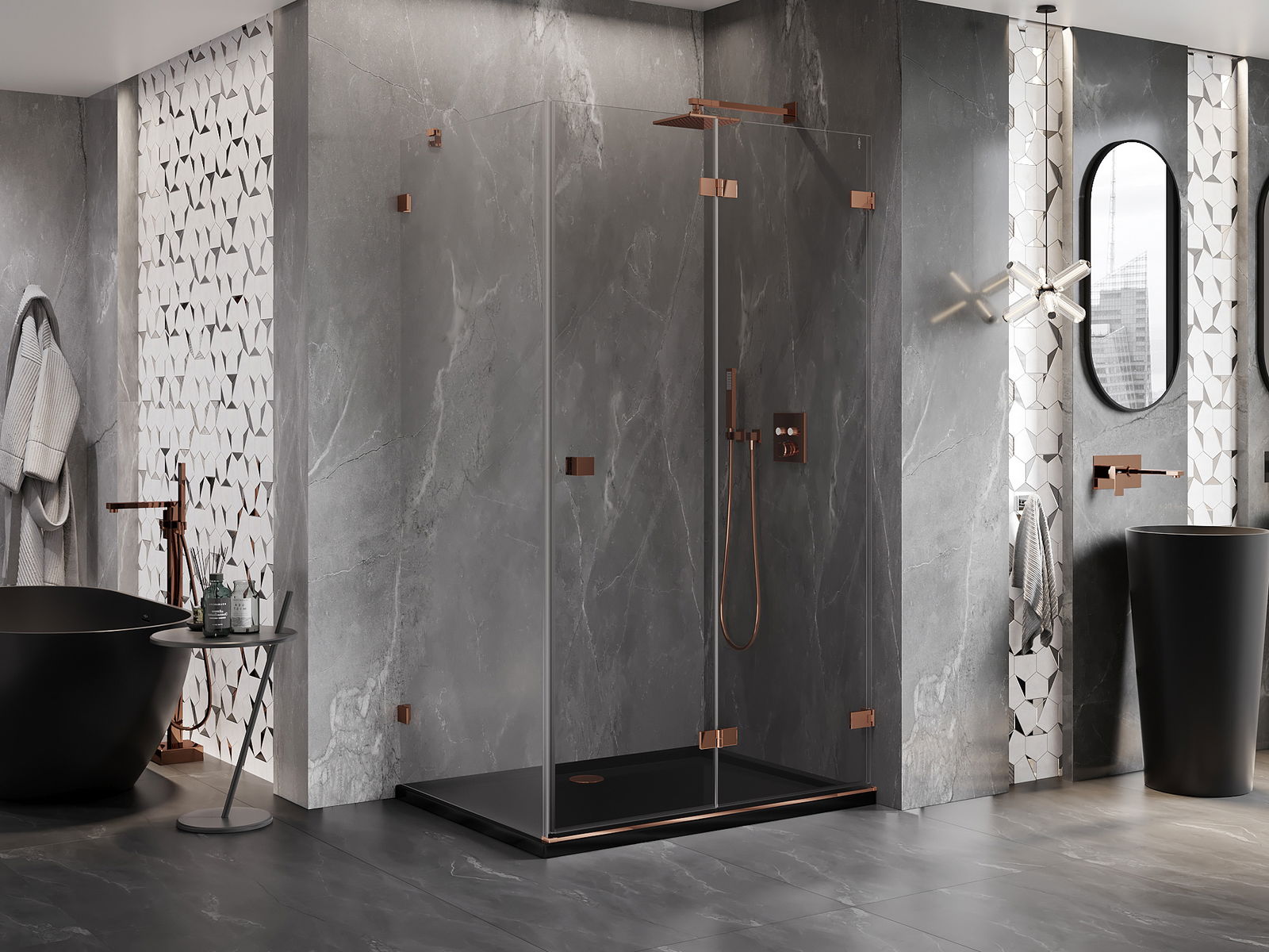 La poignée pratique et confortable est fabriquée en métal durable et résistant. Sa forme à la mode, combinée à une finition assortie à la couleur des profilés, donne à l'ensemble un aspect moderne et stylé, soulignant l'esthétique de chaque salle de bain.