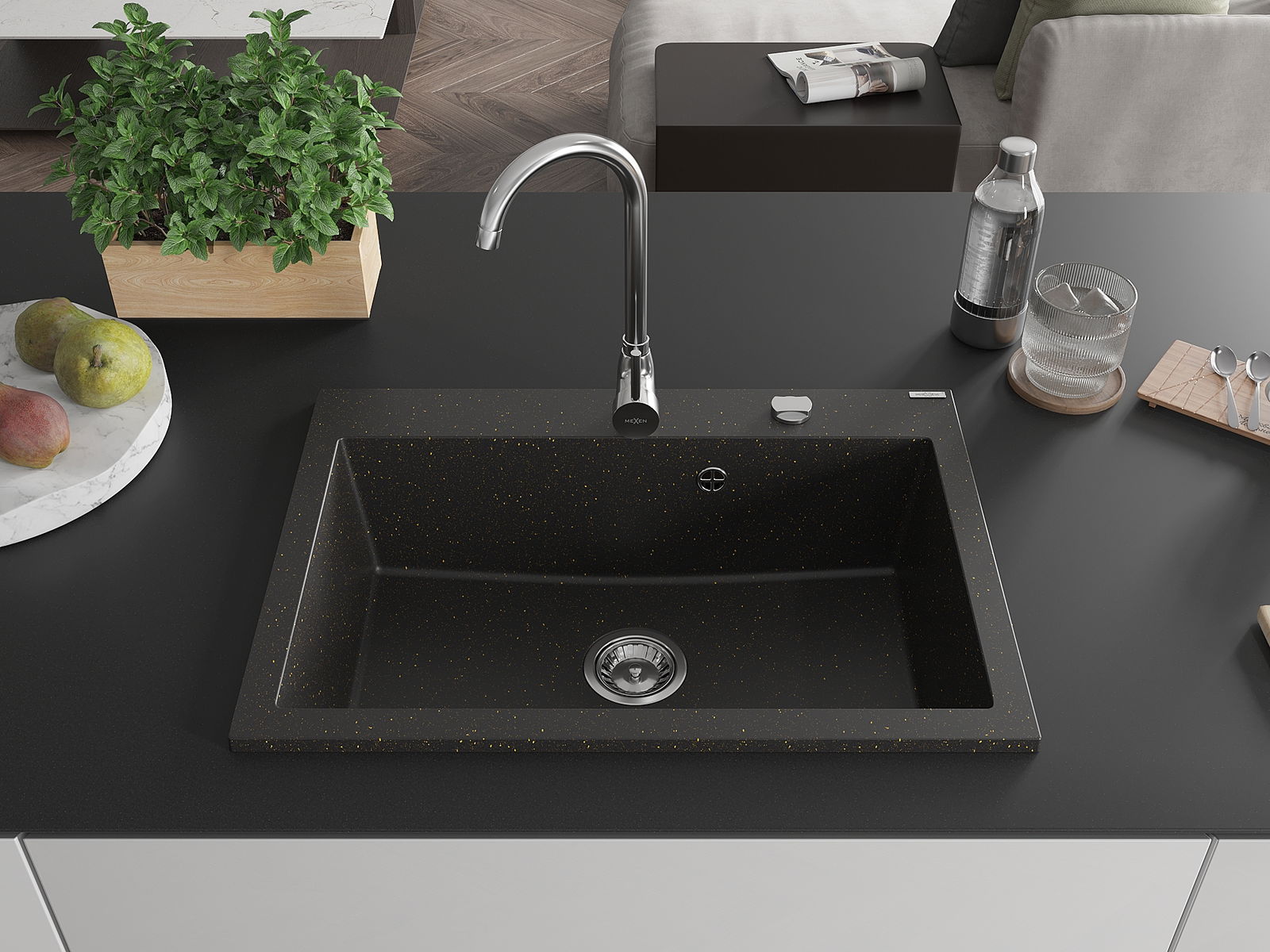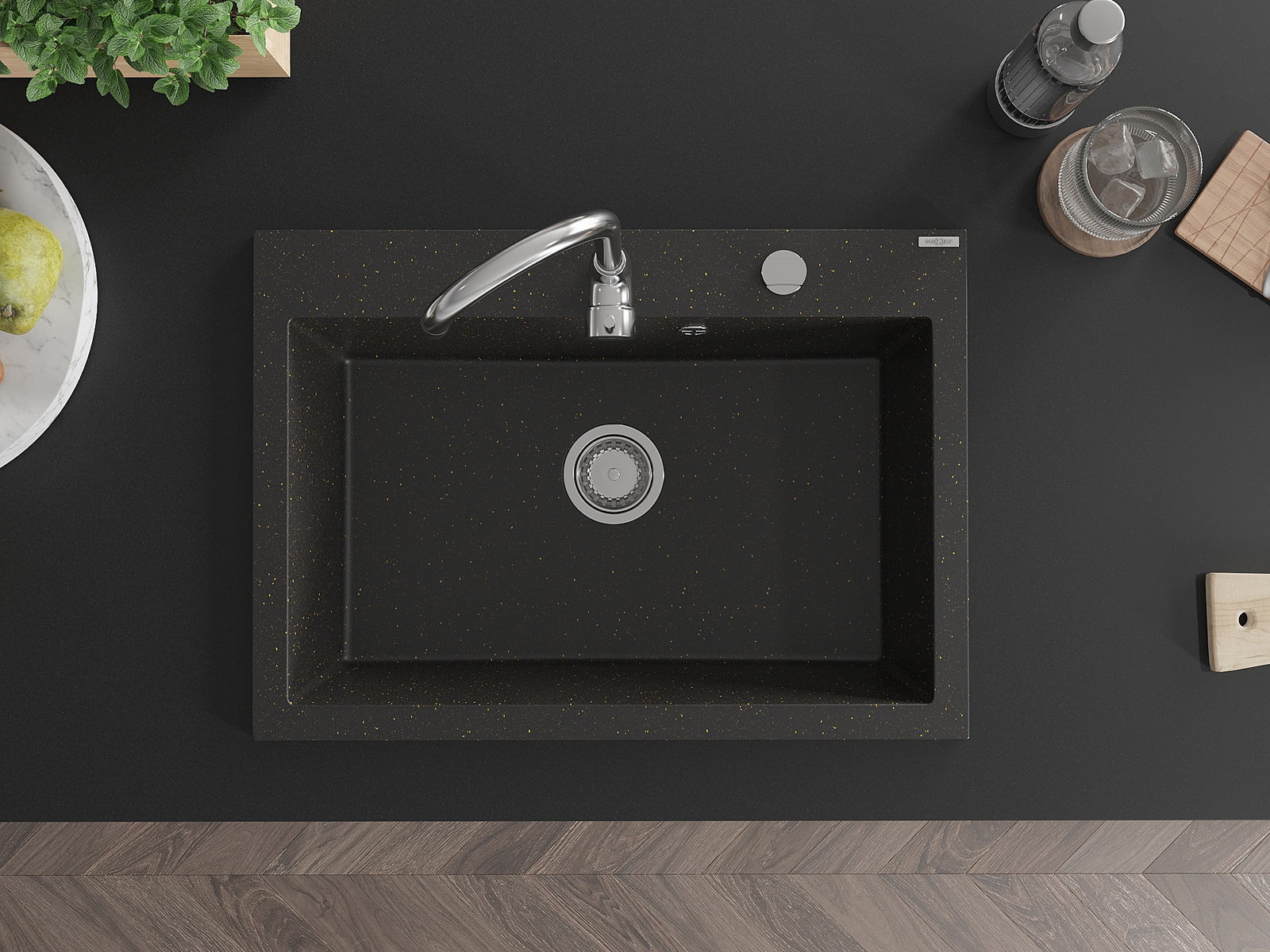 Mexen Elix évier en granit 1 bac 700 x 500 mm, noir/doré métallique, siphon chromé - 6526701005-75