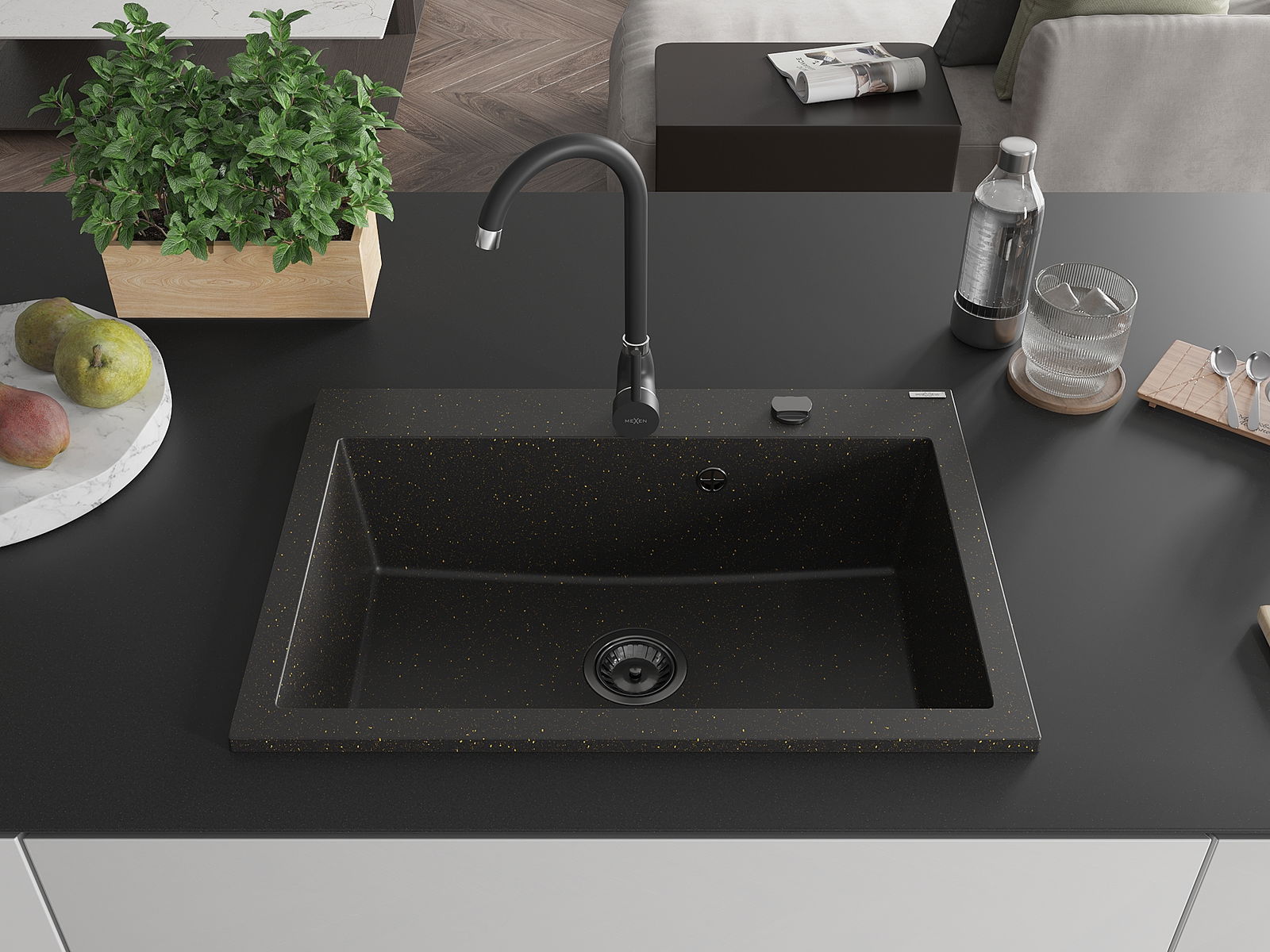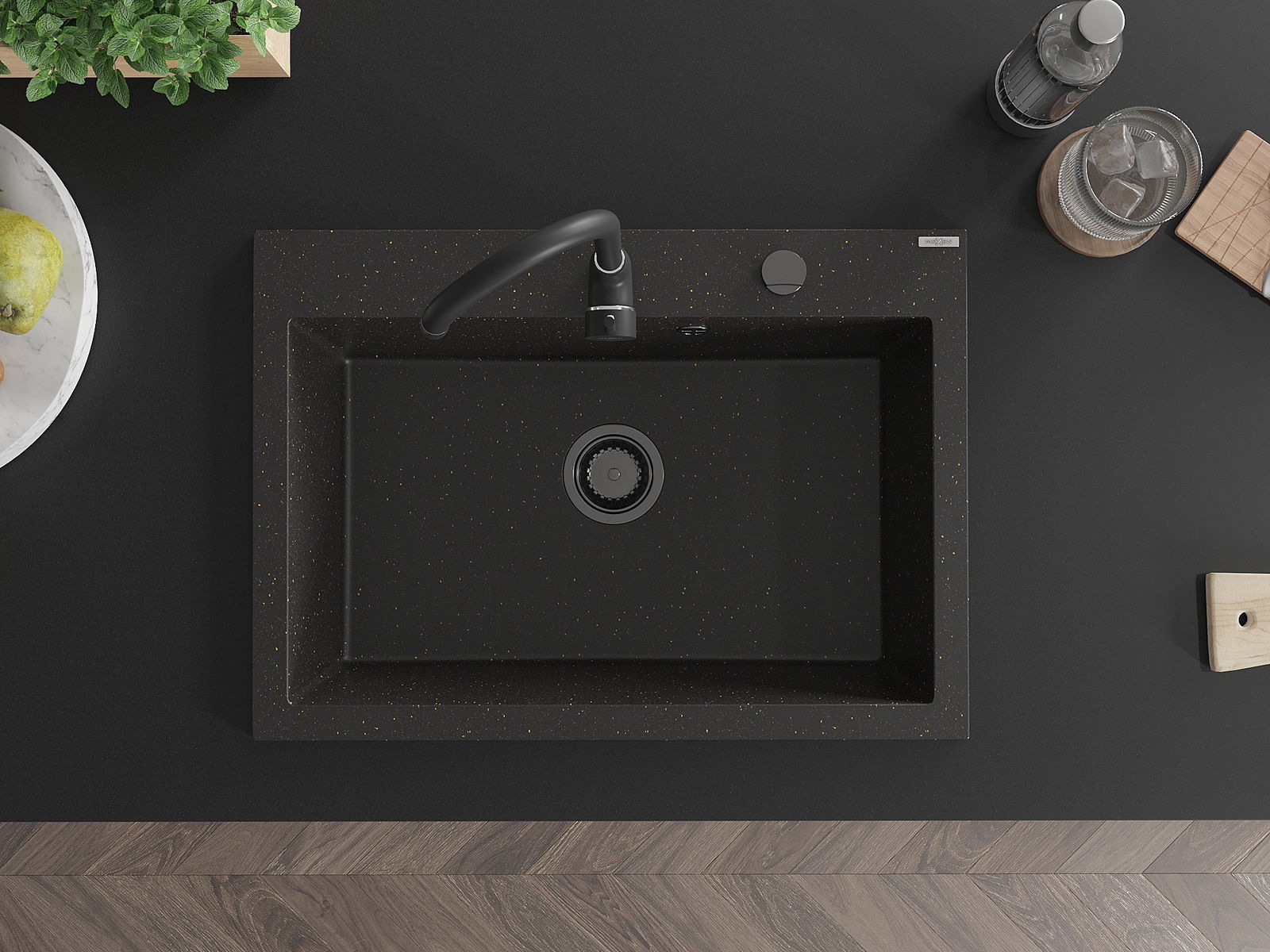 Mexen Elix évier en granit 1-bassin 700 x 500 mm, noir/or métallisé, siphon noir - 6526701005-75-B