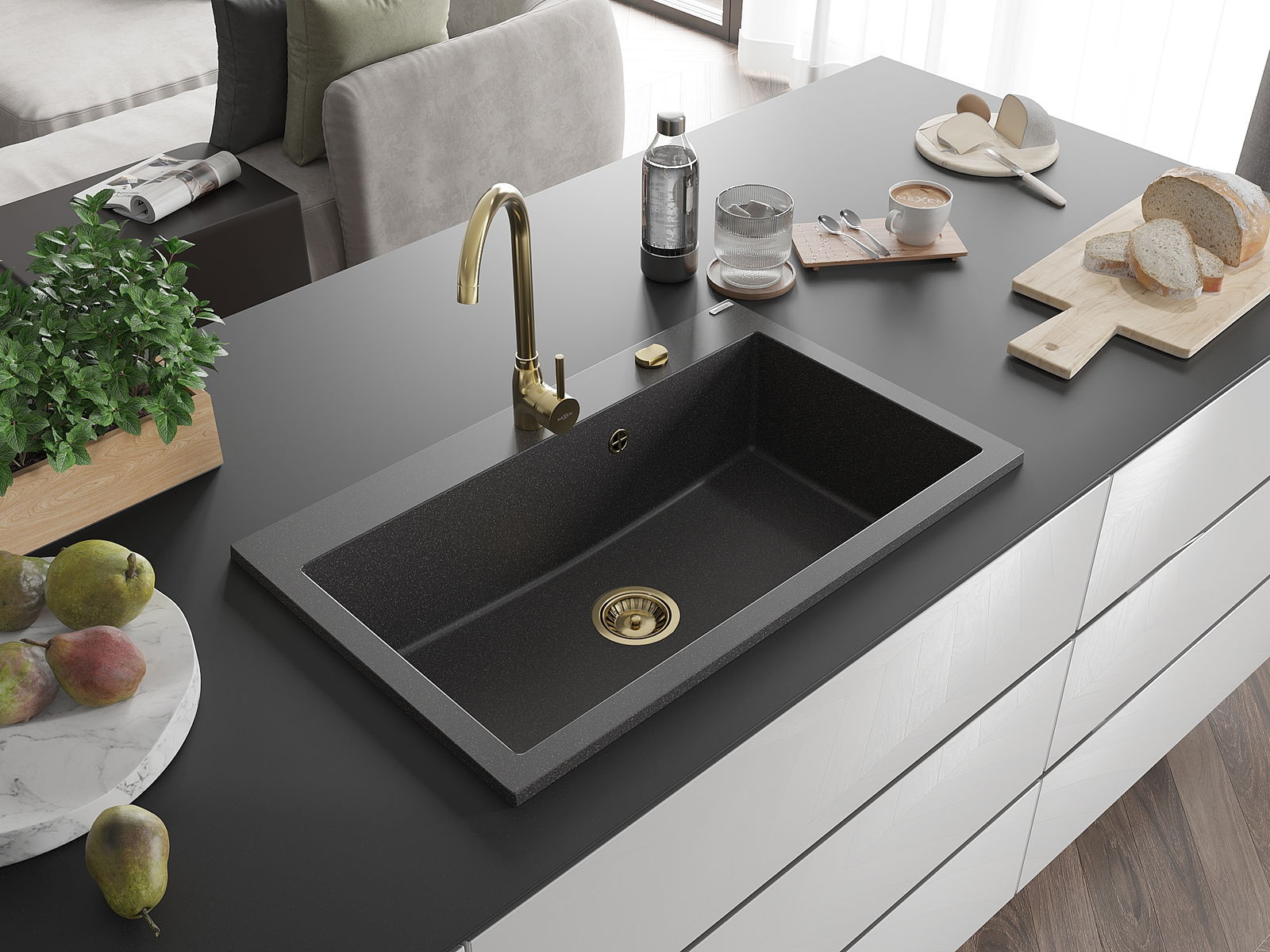 Mexen Elix évier en granit 1 bac 800 x 500 mm, noir moucheté, siphon doré - 6527801005-76-G