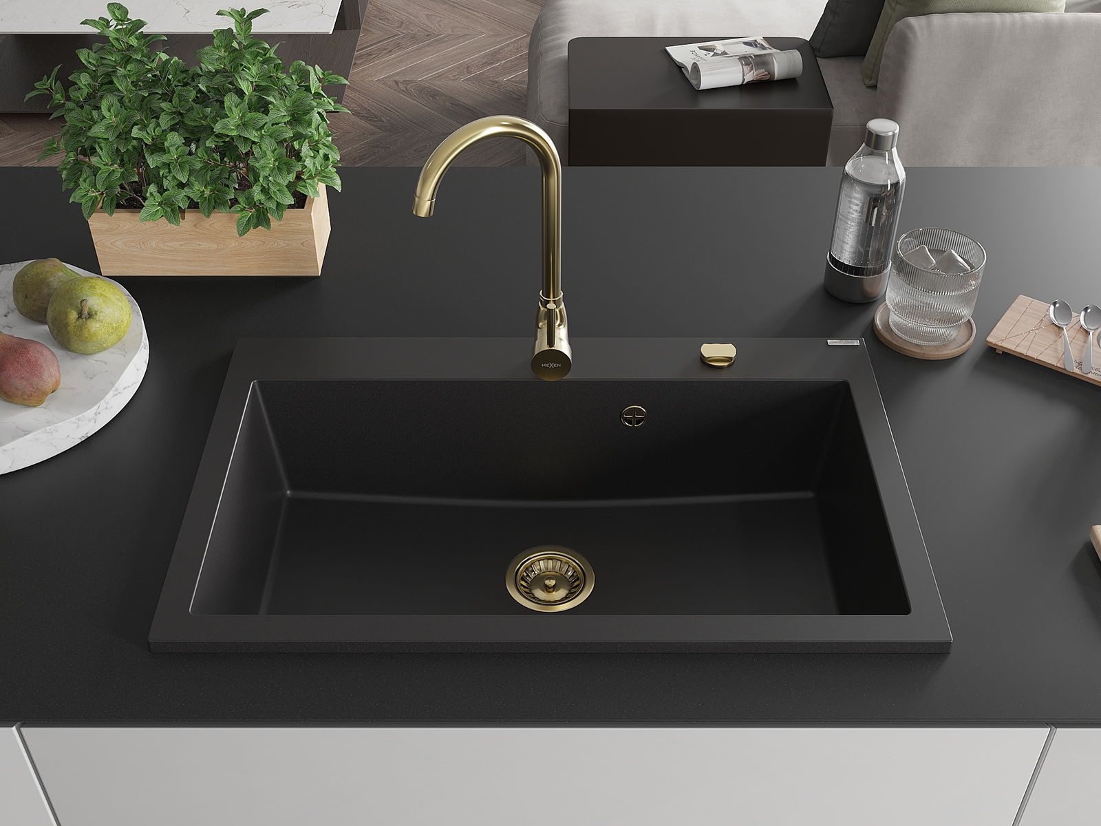 L'évier a un trou sous-meulé de 35 mm de diamètre à percer soi-même. Il peut être utilisé, entre autres, pour installer un distributeur de liquide, ce qui éliminera la présence de bouteilles en plastique dans la cuisine et lui donnera une finition élégante.
