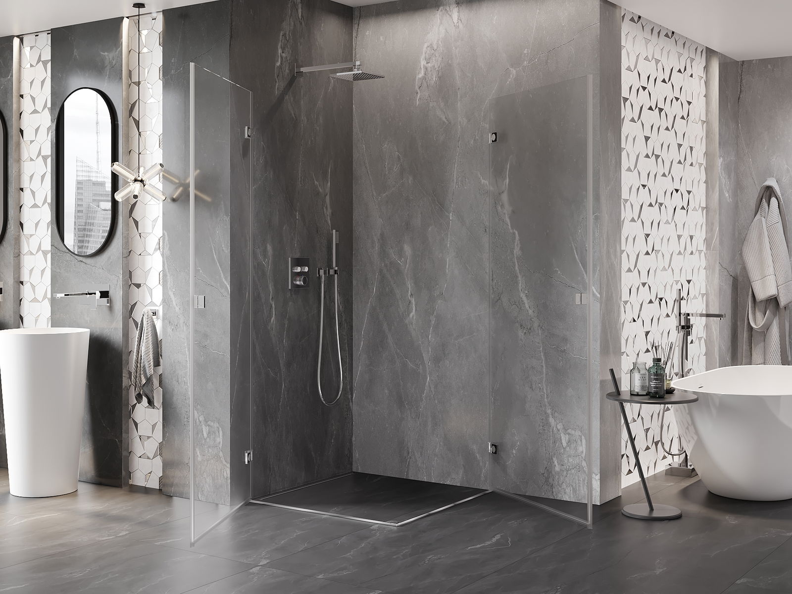 La poignée pratique et confortable est fabriquée en métal durable et résistant. Sa forme à la mode, combinée à une finition assortie à la couleur des profilés, donne à l'ensemble un aspect moderne et stylé, soulignant l'esthétique de chaque salle de bain.